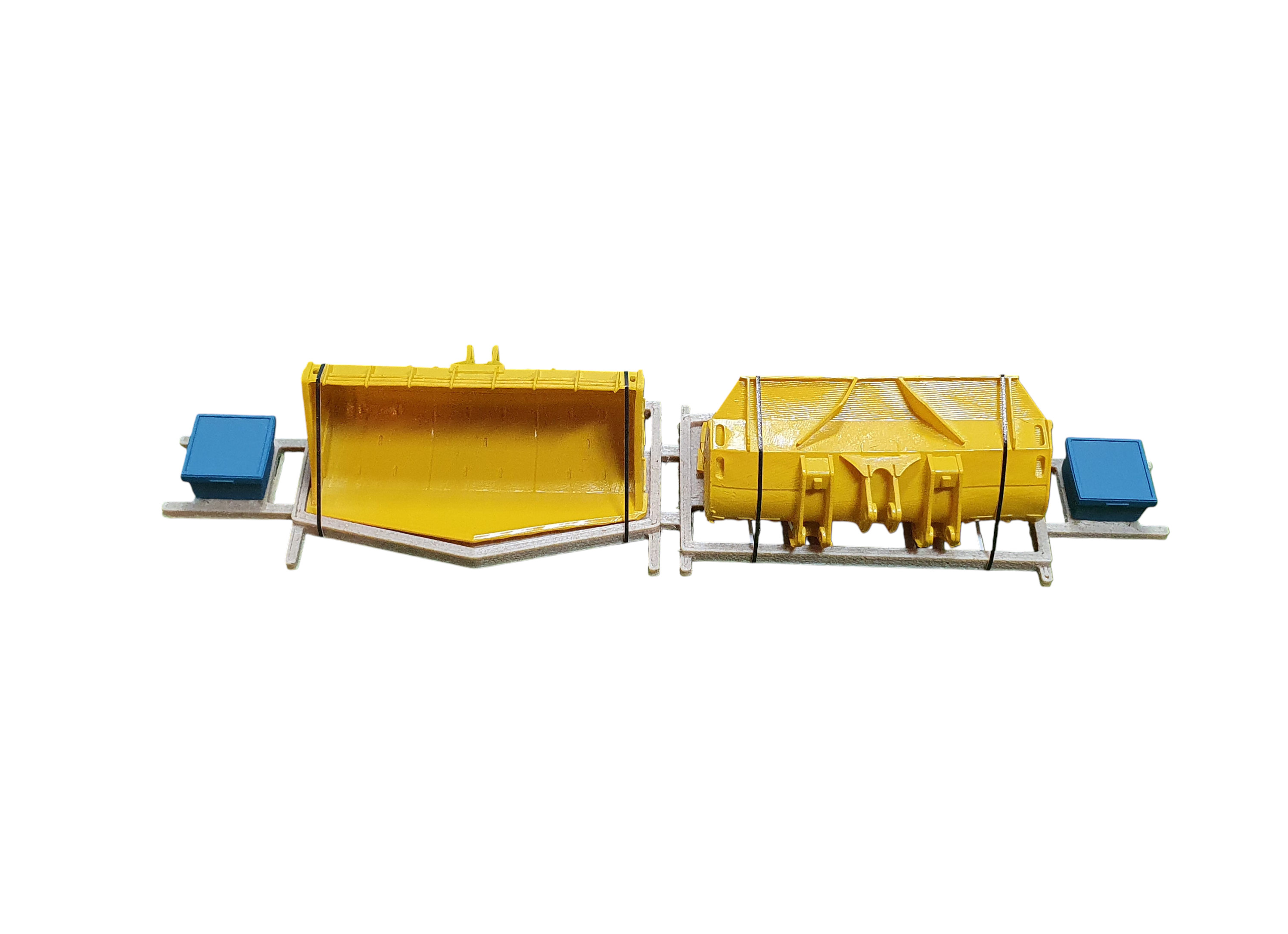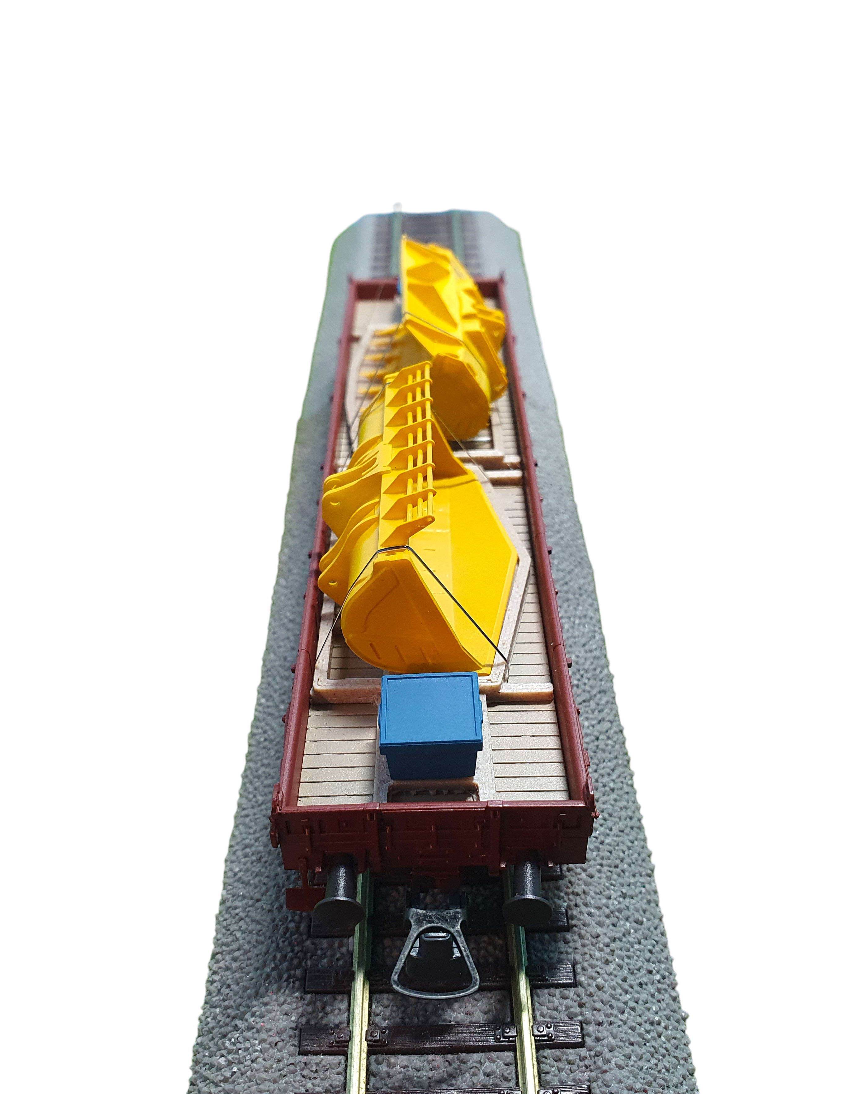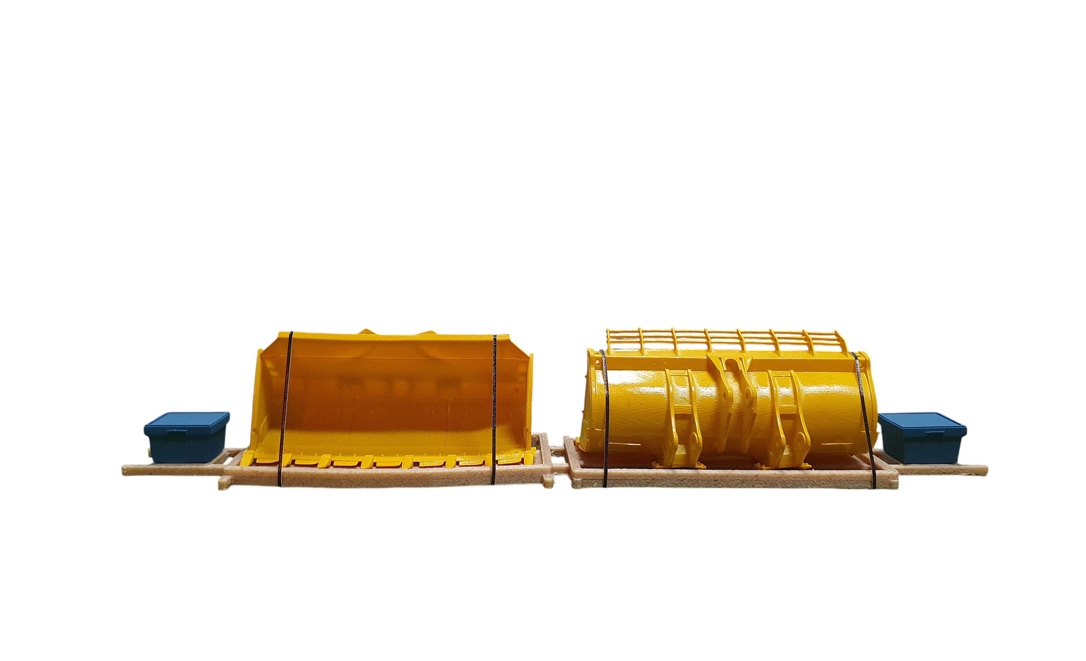 H0 Ladegut – zwei gelbe Baggerschaufeln mit zwei blauen Werkzeugboxen und schwarzen Zurrgurten auf Holzrahmen (Nachbildung)