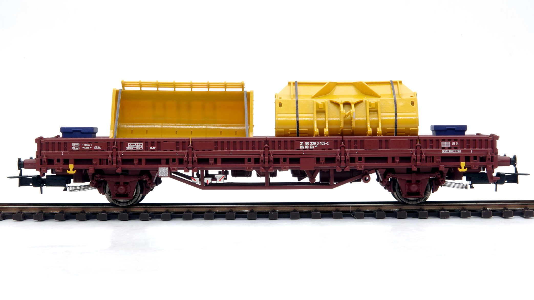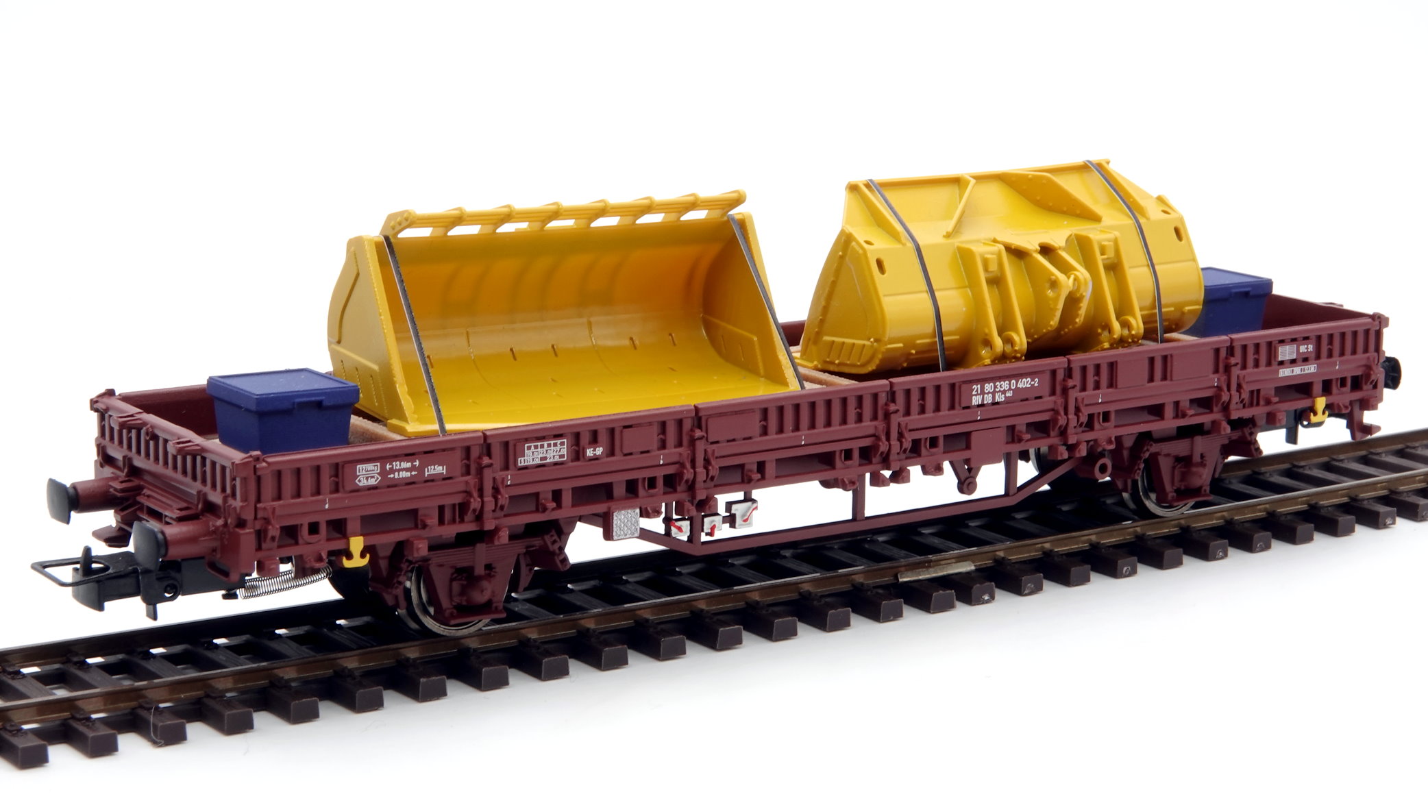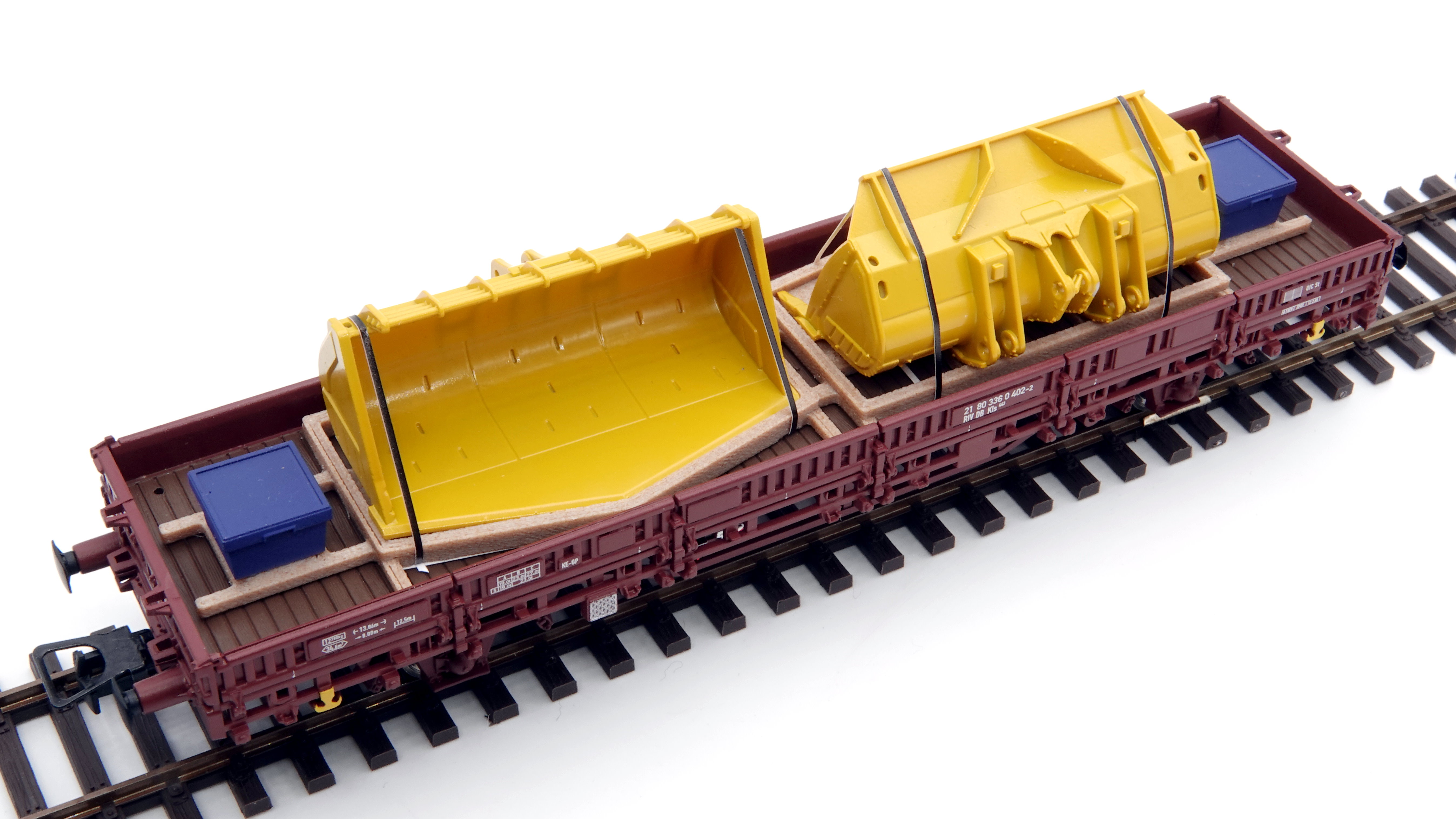 H0 Ladegut – zwei gelbe Baggerschaufeln mit zwei blauen Werkzeugboxen und schwarzen Zurrgurten auf Holzrahmen (Nachbildung)