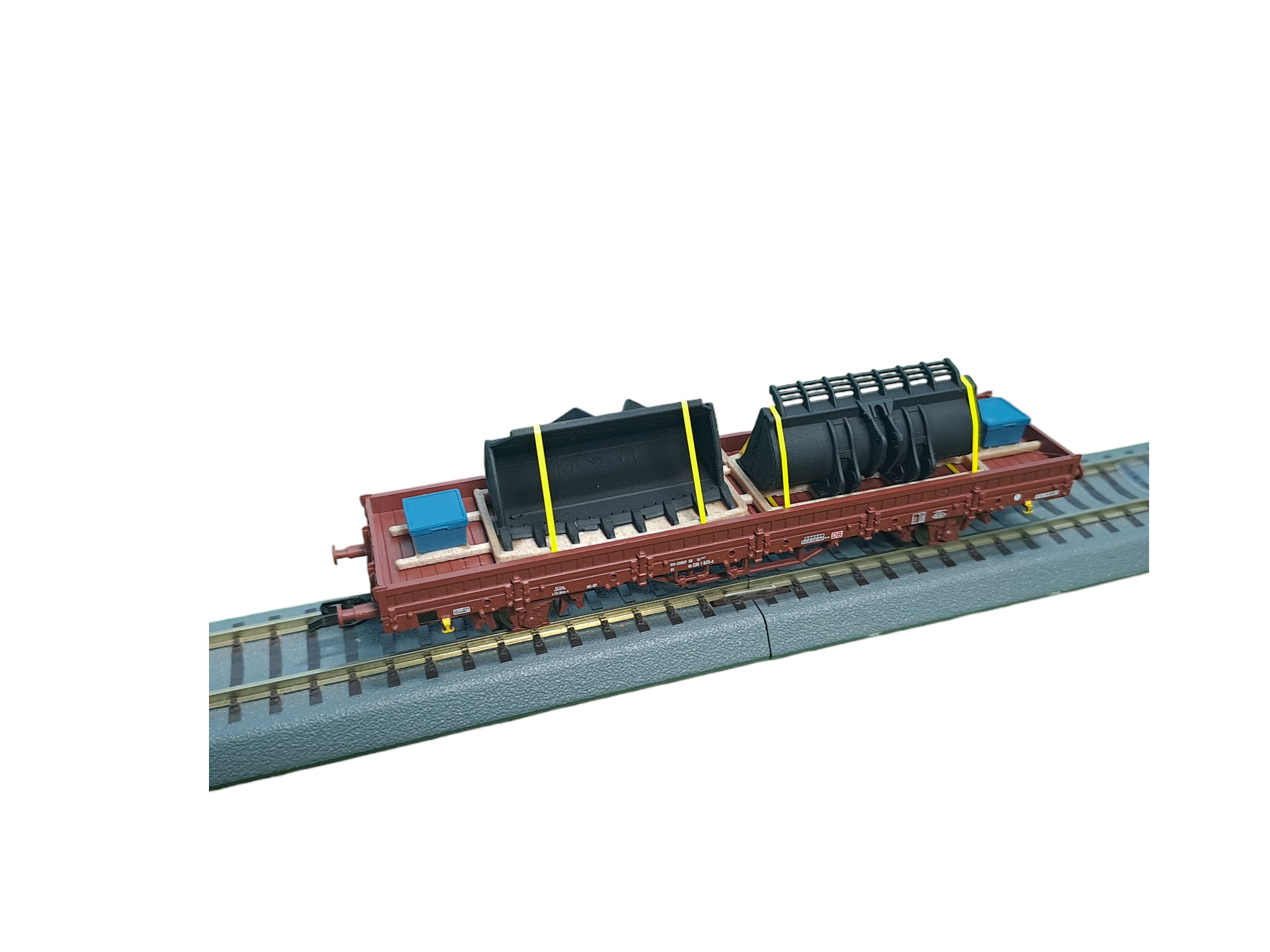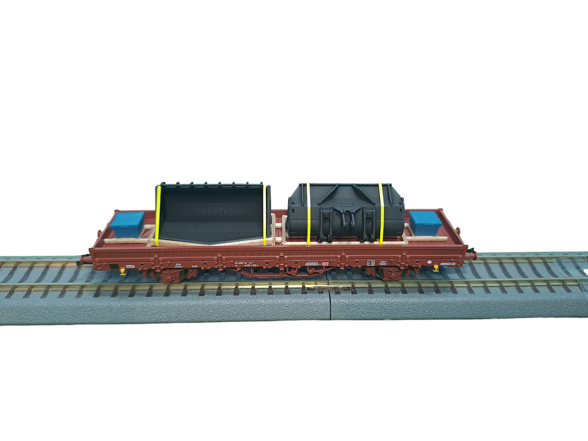H0 Ladegut – zwei schwarze Baggerschaufeln mit zwei blauen Werkzeugboxen und gelben Zurrgurten auf Holzrahmen (Nachbildung)