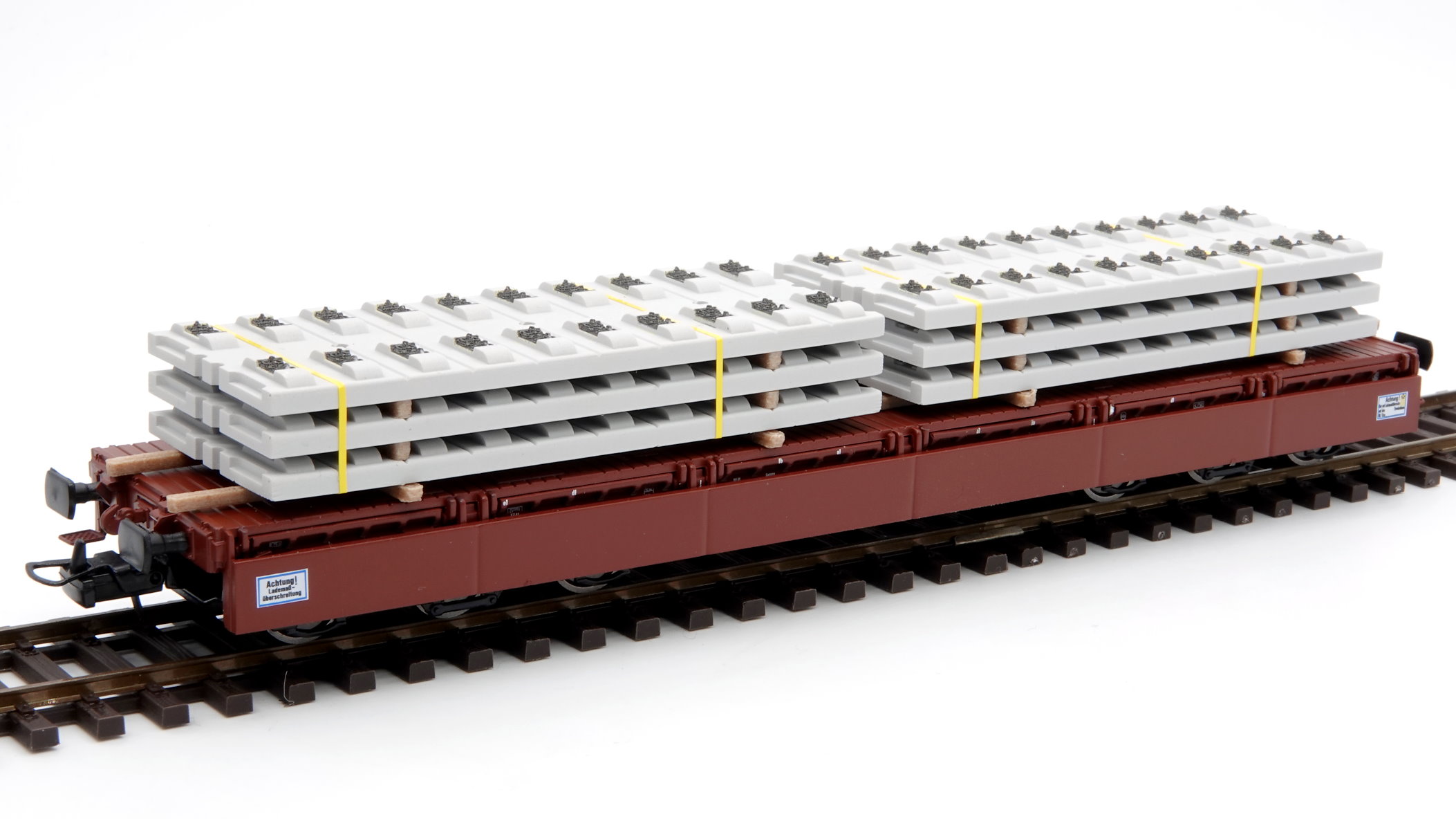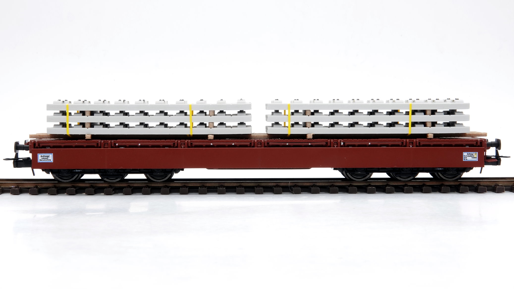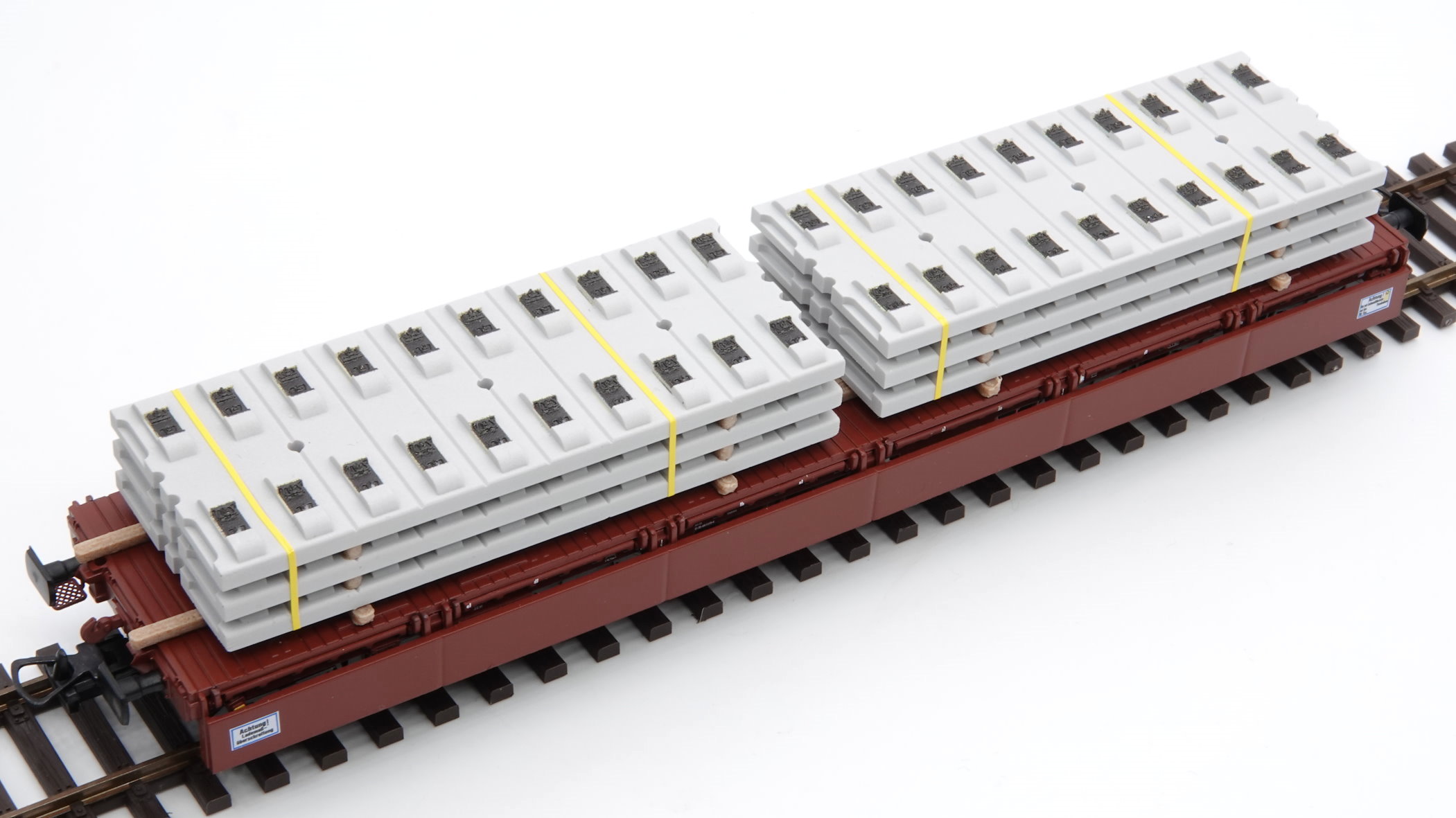 H0 Ladegut – 2 Stapel Feste Fahrbahn System Bögl für Tunnel mit gelben Zurrgurten auf Holzbalken zur Beladung von Samms Schwerlastwagen