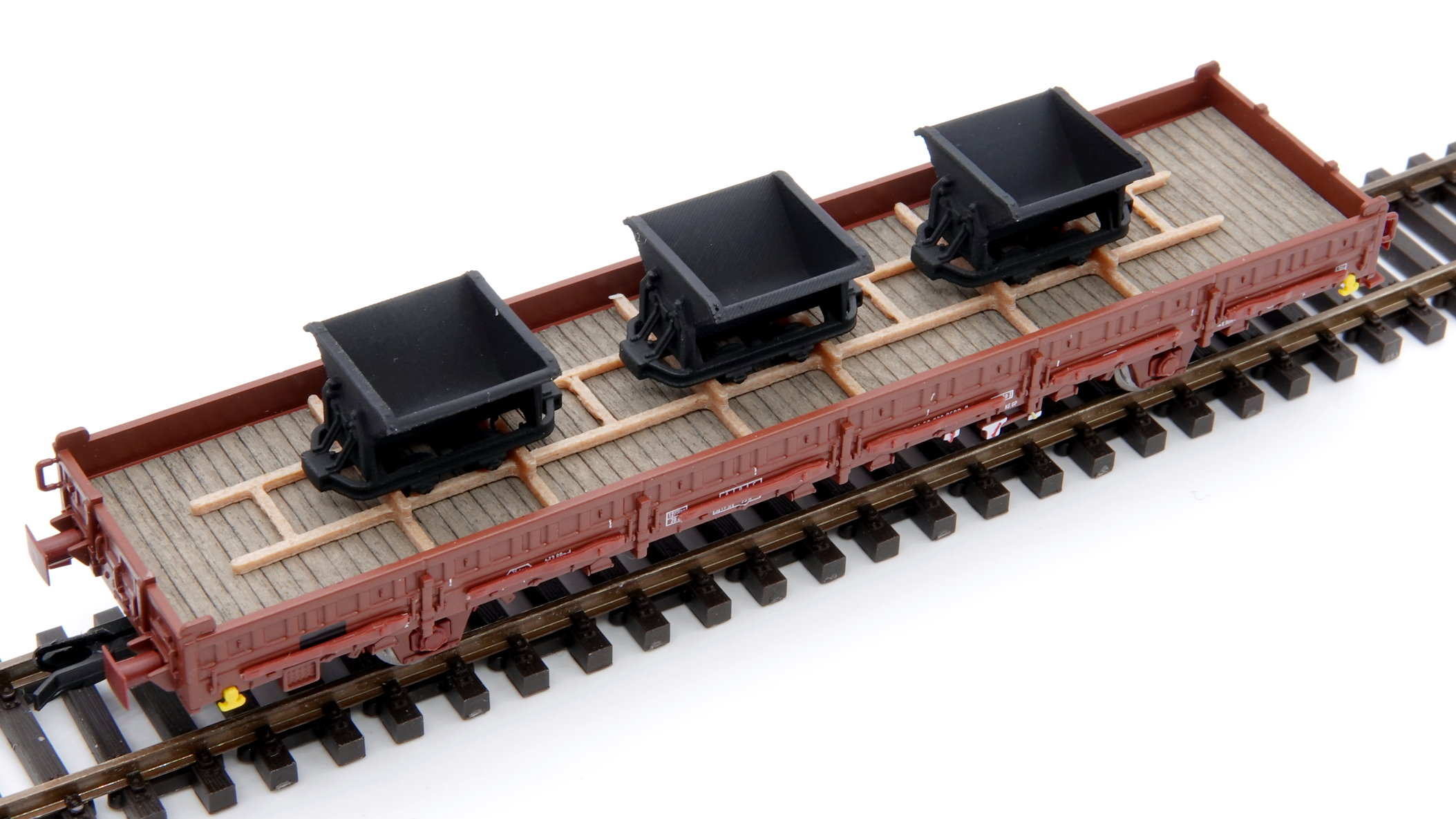 Hochwertige Ladegut-Nachbildung für Modellbahner mit Blick fürs Detail: Drei detaillierte Loren in klassischer Grubenausführung, sicher auf einem Holzrahmen platziert – passend für Flachwagen der Spurweite TT (1:120).