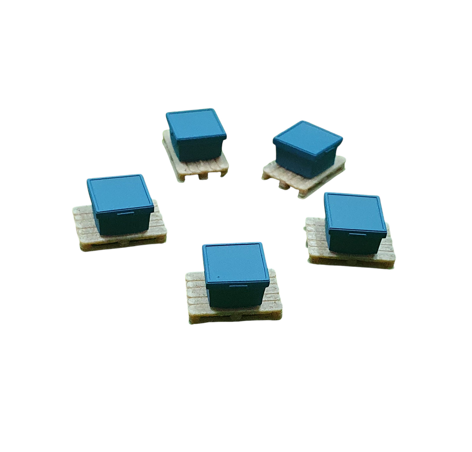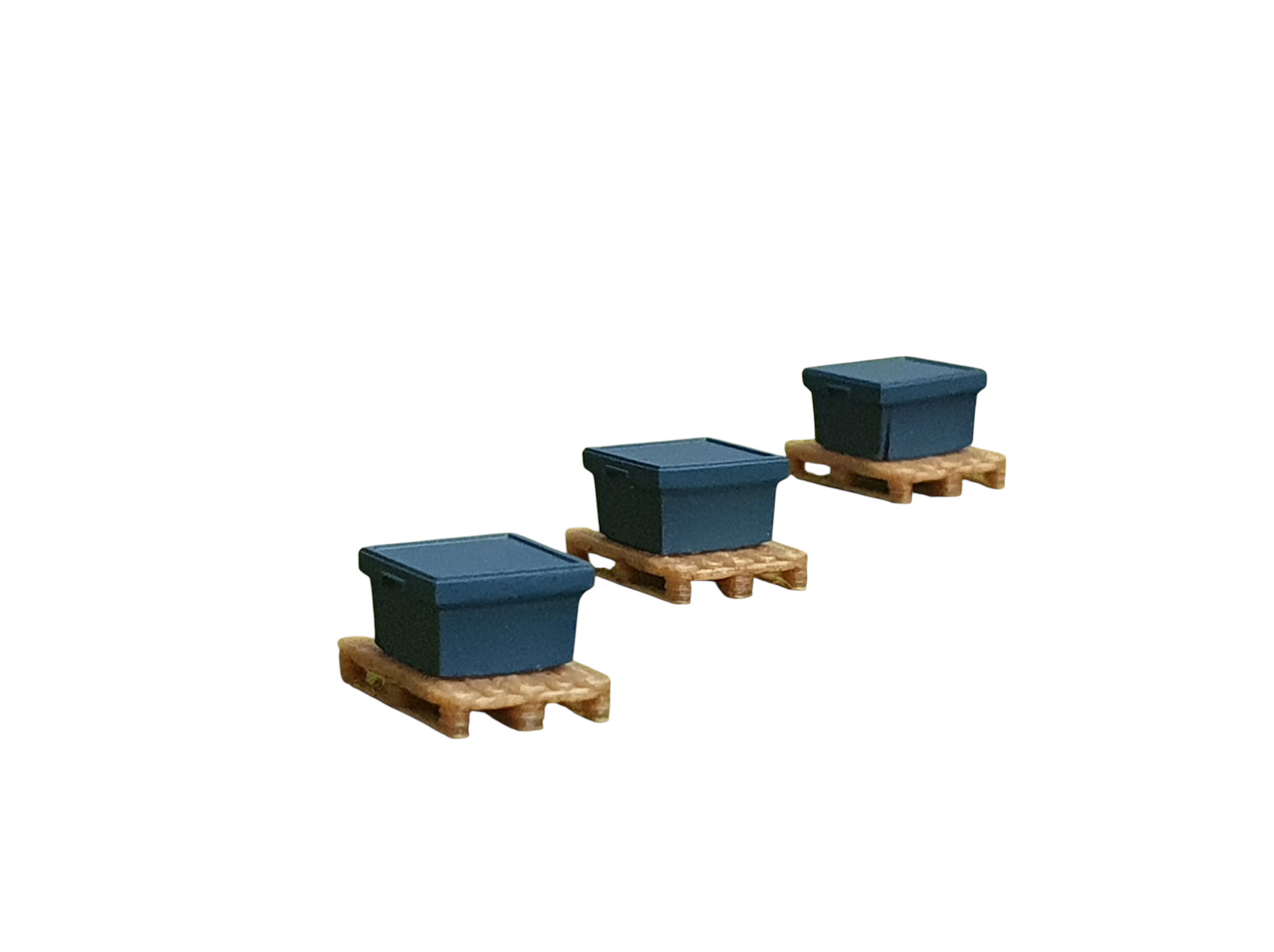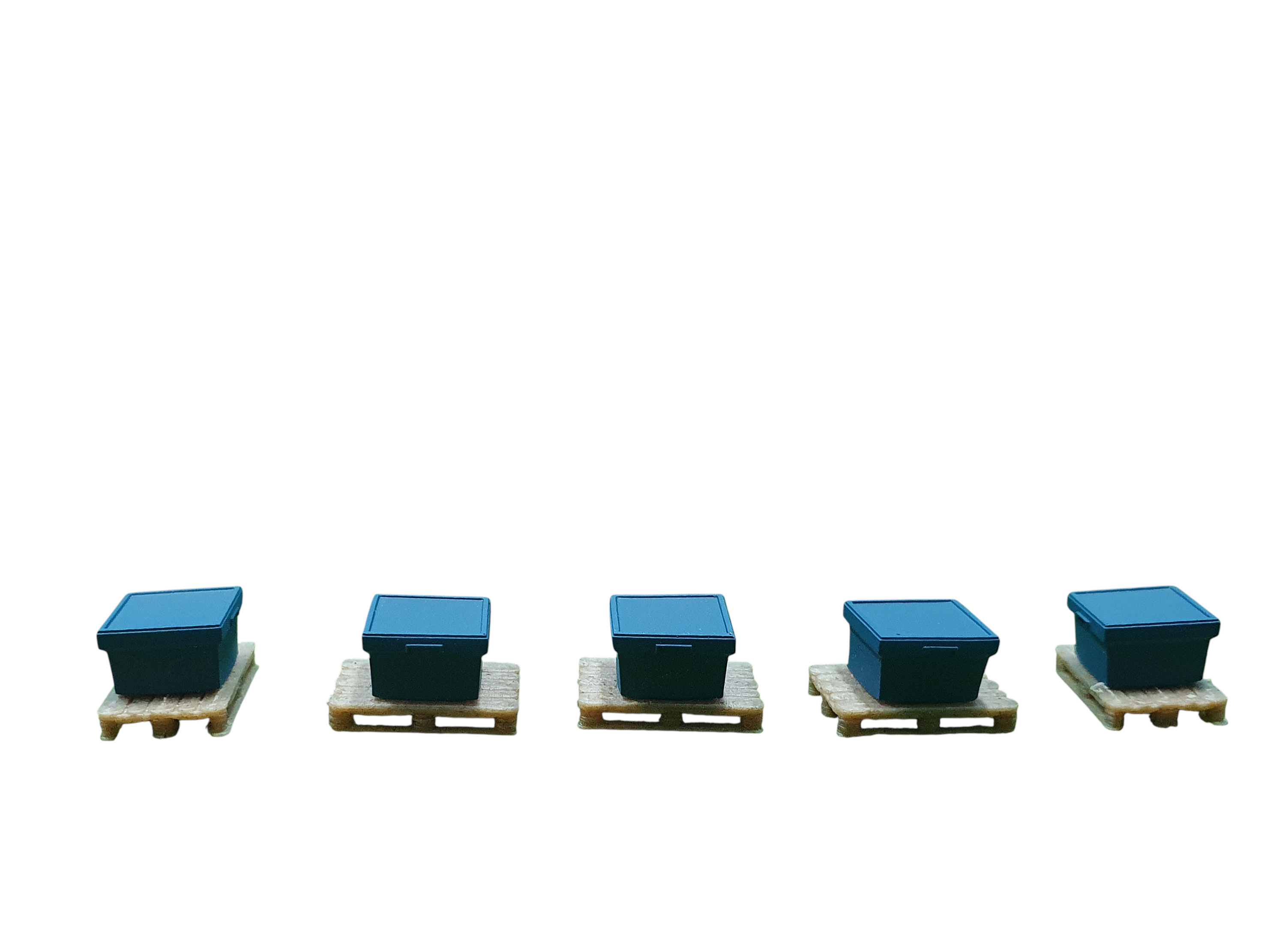 Set: Fünf blaue Zubehörkisten auf Palette (Holznachbildung)