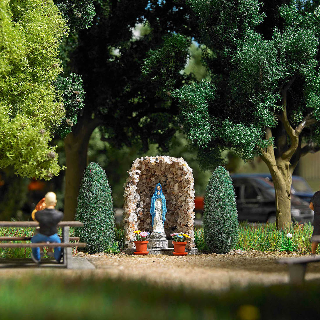 Steingrotte ( 20 x 12 mm, 21 mm hoch) mit Marienfigur auf Steinsockel (Fertigmodell), zwei Sitzbänke und zwei Blumenkübel mit Bepflanzung (Bausatz).