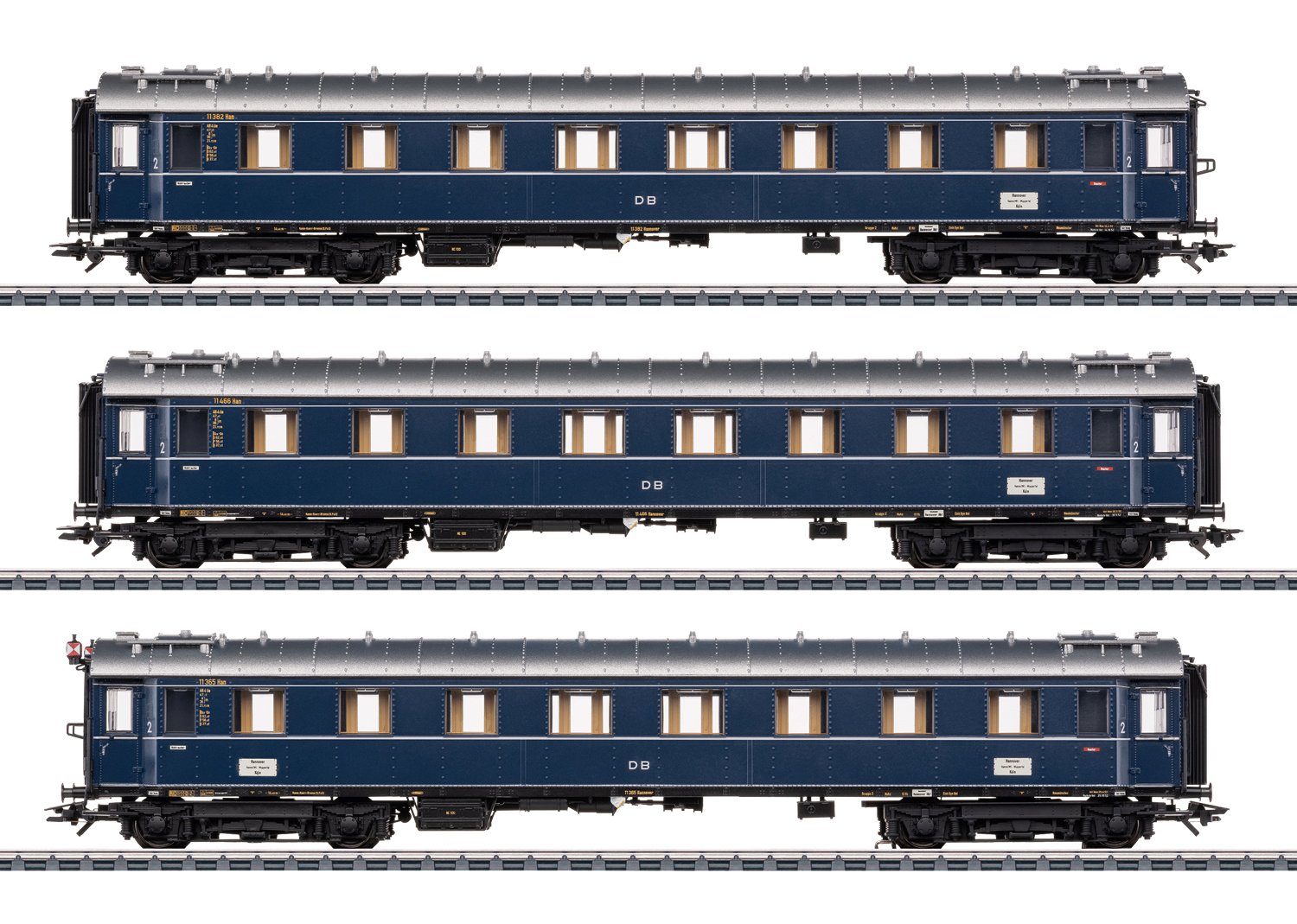 Modell: Detaillierte Ausführung in vollem Längenmaßstab. Alle Wagen mit serienmäßig eingebauter LED-Innenbeleuchtung mit warmweißen Leuchtdioden (LED) und Pufferkondensator. Ein Wagen serienmäßig an einem Ende mit Zugschlussbeleuchtung ausgestattet. Der an diesem Wagen befindliche Schleifer für die Stromaufnahme versorgt über die serienmäßig eingebauten stromführenden Kurzkupplungköpfe den ganzen Wagenverband mit Strom. Dazu ist eine fest definierte Fahrzeugreihenfolge vorgegeben. An beiden Enden des Wagenverbandes sind die normalen neuen Kurzkupplungsköpfe für niedrigere Pufferhöhen eingesetzt. Reisezugwagen mit mehrfarbiger Inneneinrichtung. Drehgestelle der Bauart Görlitz II schwer. Stirnseitig separat angesetzte Aufstiegsleitern und angesetzte Griffstangen. Befahrbarer Mindestradius 360 mm. Gesamtlänge über Puffer ca. 75,5 cm.