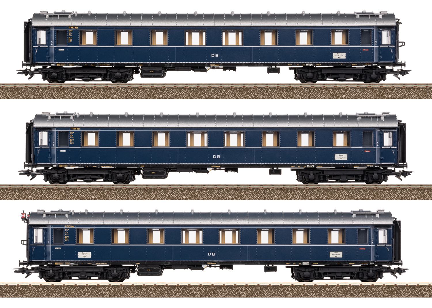 Modell: Detaillierte Ausführung in vollem Längenmaßstab. Alle Wagen mit serienmäßig eingebauter LED-Innenbeleuchtung mit warmweißen Leuchtdioden (LED) und Pufferkondensator. Ein Wagen serienmäßig an einem Ende mit Zugschlussbeleuchtung ausgestattet. Reisezugwagen mit mehrfarbiger Inneneinrichtung. Drehgestelle der Bauart Görlitz II schwer. Stirnseitig separat angesetzte Aufstiegsleitern und angesetzte Griffstangen. Befahrbarer Mindestradius 360 mm. Gesamtlänge über Puffer ca. 75,5 cm.