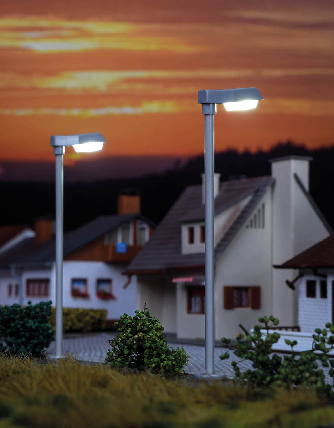 Eine beleuchtete Modellbahnanlage lässt nicht nur Kinderaugen leuchten. Die richtige Beleuchtung ist für das Gesamtbild Ihrer Anlage ein ganz wesentlicher Bestandteil. Eine gut gestaltete Modellbahnleuchte muss trotz aller Rücksicht auf die maßstäbliche Verkleinerung so beschaffen sein, dass man ihre Hauptkonturen auch noch aus größerer Entfernung erkennen kann. Modellbahnleuchten von Viessmann setzen nicht nur echte "Glanzpunkte", sondern sie glänzen auch durch hochwertige Verarbeitung und trotz feinster Detaillierung mit robuster Qualität.