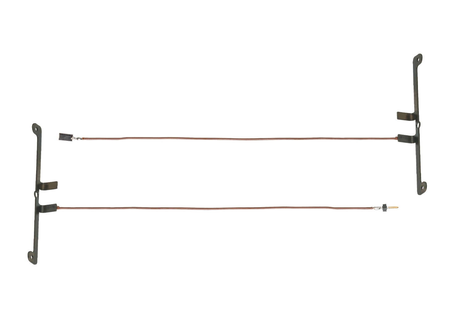 Stromzuführung für die Nachrüst-Innenbeleuchtungen 73410 und 73411, bestehend aus einem Achslager mit angelötetem Kabel und Buchse sowie einem Achslager mit angelötetem Kabel und Stecker für den elektrischen Anschluss. Verwendbar für die vierachsigen Schnellzugwagen der Einheitsbauart 1928 bis 1930, mit symmetrischen Drehgestell-Befestigungen.