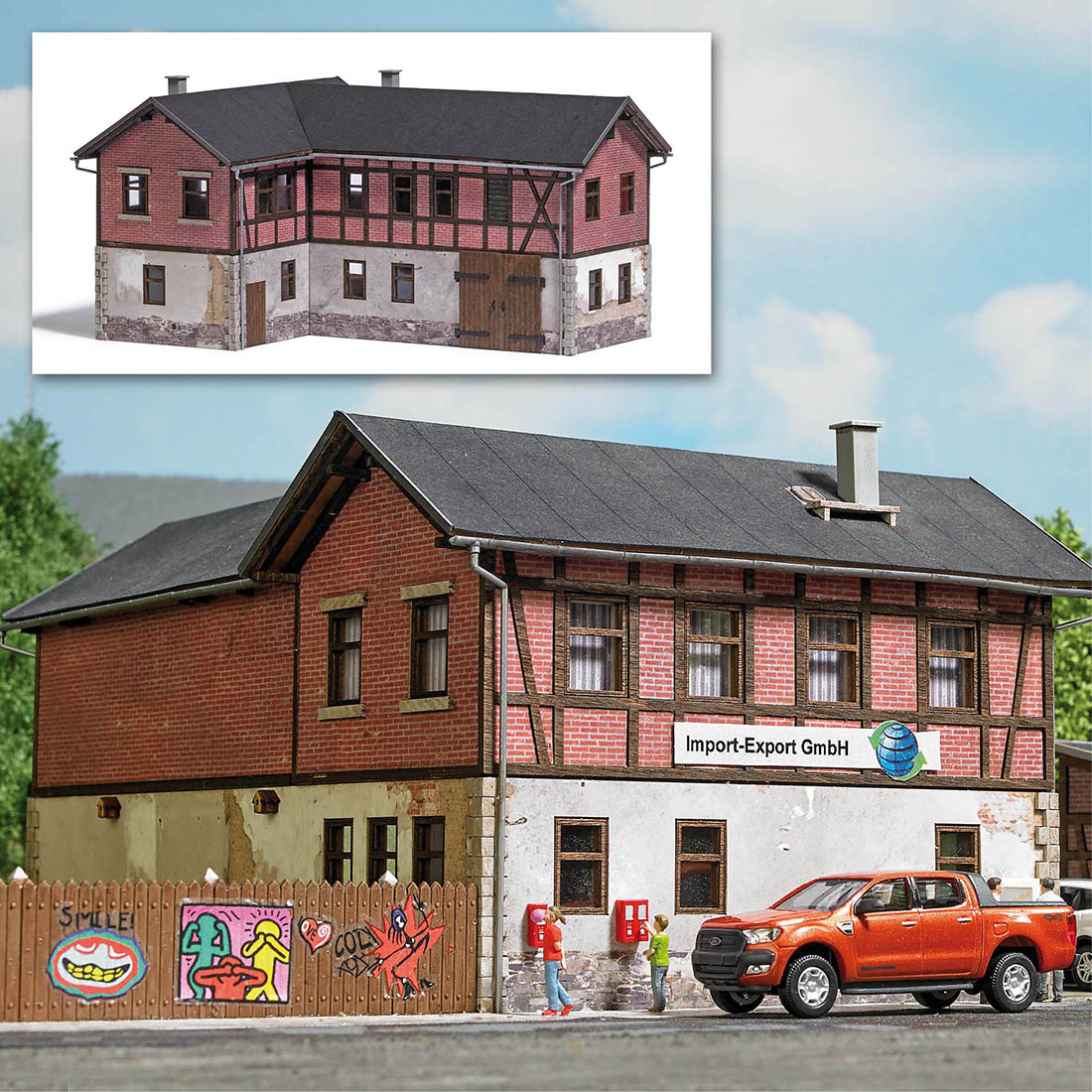 Dieses marode Gebäude ist als Handwerker- oder Bauernhaus, Werkstatt oder kleine Fabrik universell einsetzbar. Echtes Holz wird für das Fachwerk im Obergeschoss sowie für Türen, Tore und Fenster verwendet. Das untere Stockwerk besitzt eine verwitterte Putzfassade, die in super-realistischer 3D-Optik ausgeführt ist. Die matte Oberfläche hat einen modellgerecht rauen Charakter in Optik und Haptik. Mit Nachbildung der Natursteinverblendung an den Ecken. Das doppelflügelige Tor (Öffnung 32 x 32 mm) ist mit beweglichen Scharnieren ausgestattet. Beleuchtbar mit Busch LEDs 5998 sowie Beleuchtungssockel Busch 4280.