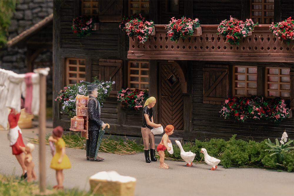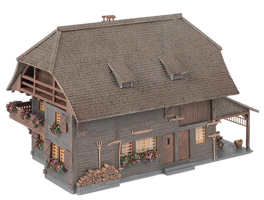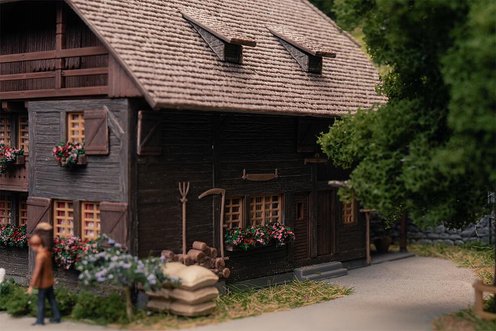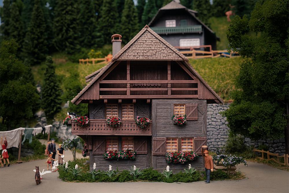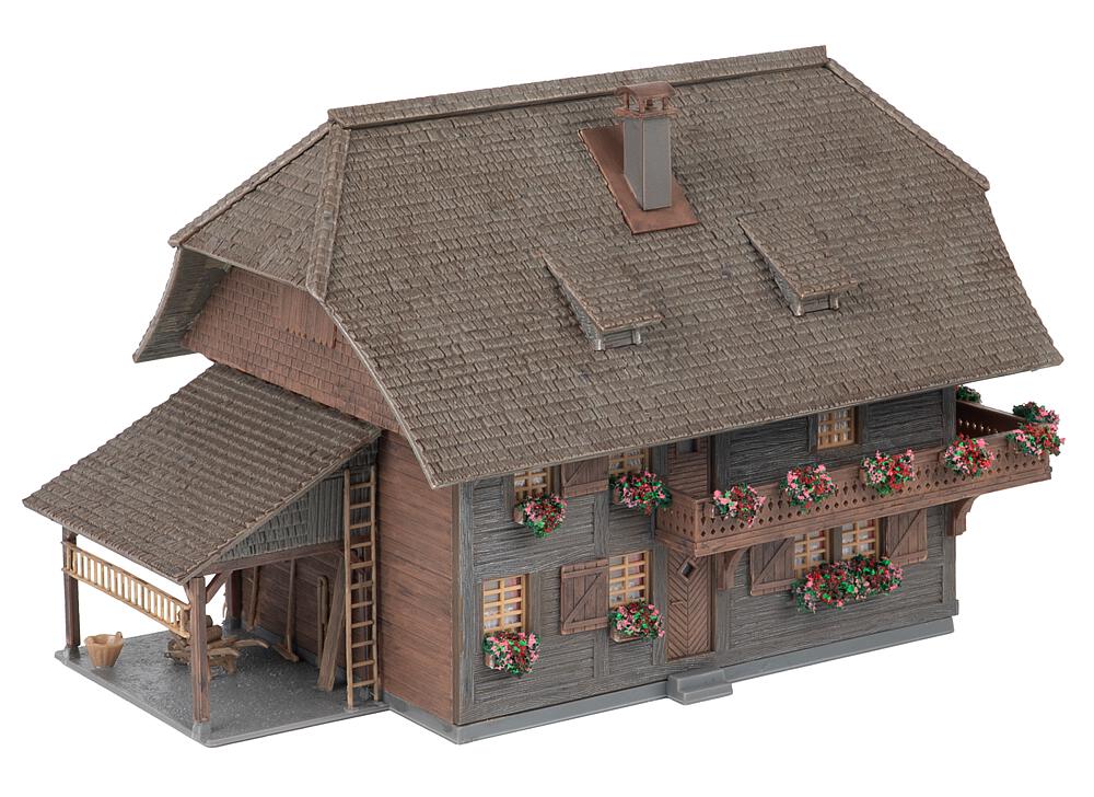 Ein charmantes, dunkles Schwarzwaldhaus, wie man es in den Höhenlagen des Schwarzwaldes findet. Blumenkästen in leuchtenden Farben schmücken die Fassade und verleihen dem Gebäude eine heimische Ausstrahlung. Dank seiner dezenten Größe fügt sich das Haus perfekt in Wiesen- und Waldlandschaften ein und eignet sich ideal für den Anlagenhintergrund. Inklusive Figur, einem Uhrenträger – ein kleines Stück Schwarzwälder Tradition für jede Modellwelt.