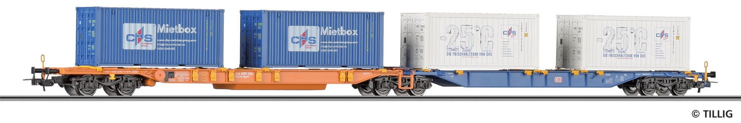 Doppeltragwagen Sdggmrs 744 der DB AG, beladen mit vier Containern "CHS Container Handel GmbH