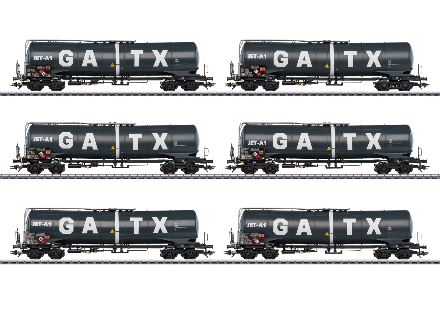 Modell: Drehgestelle der modernen Bauform Y25 Lsd1 mit Doppelbremsklötzen. Mit Bremserbühne und stirnseitigem Aufstieg. Separat angesetzte Bremsgestänge, Entleerungsrohre, Domdeckel und zahlreiche weitere Hebel und Griffstangen. Rechteckige Puffer, 6 Kesselringe, große Anschriftentafel. Alle Wagen aufwendig bedruckt und mit unterschiedlichen Betriebsnummern. Alle Wagen im Set einzeln verpackt. Länge über Puffer je Wagen ca. 19,6 cm. Gleichstromradsatz E700580.