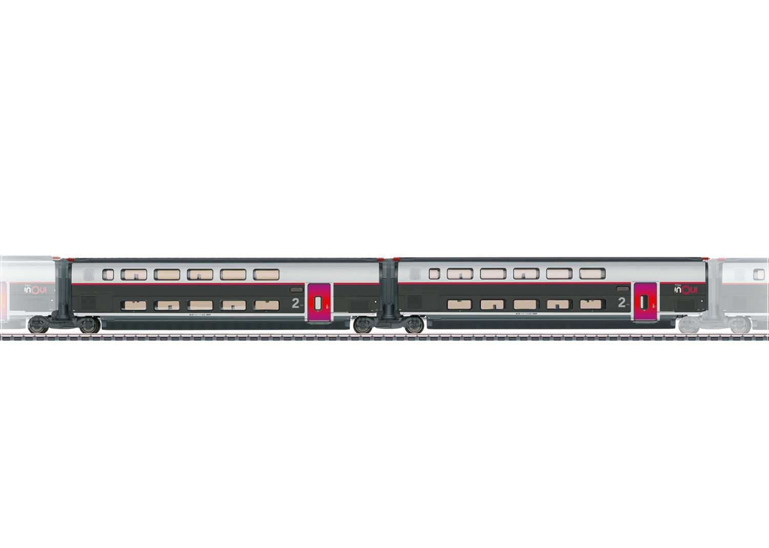 Modell: 2-teiliges Ergänzungswagen-Set zur Erweiterung des Hochgeschwindigkeitszuges TGV INOUI, Artikel 37798, auf eine 10-teilige Einheit. Serienmäßig eingebaute Innenbeleuchtung mit wartungsfreien warmweißen Leuchtdioden (LED). Innenbeleuchtung wird versorgt über die durchgehende elektrische Verbindung des ganzen Zuges. Beide Mittelwagen sind fest miteinander gekuppelt. Kulissenführung in den Jakobs-Drehgestellen. Maßstäbliche Nachbildung, daher befahrbarer Gleisbogen ab Mindestradius 360 mm bei freiem Lichtraum. Länge des Wagenpaares 43 cm.