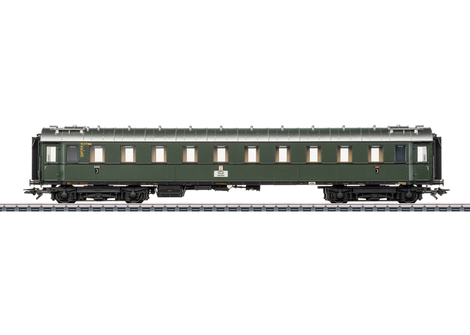 Modell: Detaillierte Ausführung in vollem Längenmaßstab. Befahrbarer Mindestradius 360 mm. Mit serienmäßig eingebauter LED-Innenbeleuchtung, mit warmweißen Leuchtdioden (LED) und Pufferkondensator. Die Innenbeleuchtung funktioniert über die serienmäßig eingebauten stromführenden Kurzkupplungen im Verbund mit dem Schnellzugwagen ABC4ü, 1./2./3. Klasse aus Artikel 42491, mit Schleifer zur Stromaufnahme. Dazu ist eine fest definierte Fahrzeugreihenfolge vorgegeben. Ein kurzer Faltenbalg liegt zum Austausch bei. Aufgedrucktes Wagenlaufschild und Ordnungsnummer. Ein Leporello zeigt die Darstellung des gesamten Zuges und die vorbildgerechte Einordnung der einzelnen Wagen im Zug-Verband. Länge über Puffer 25 cm.