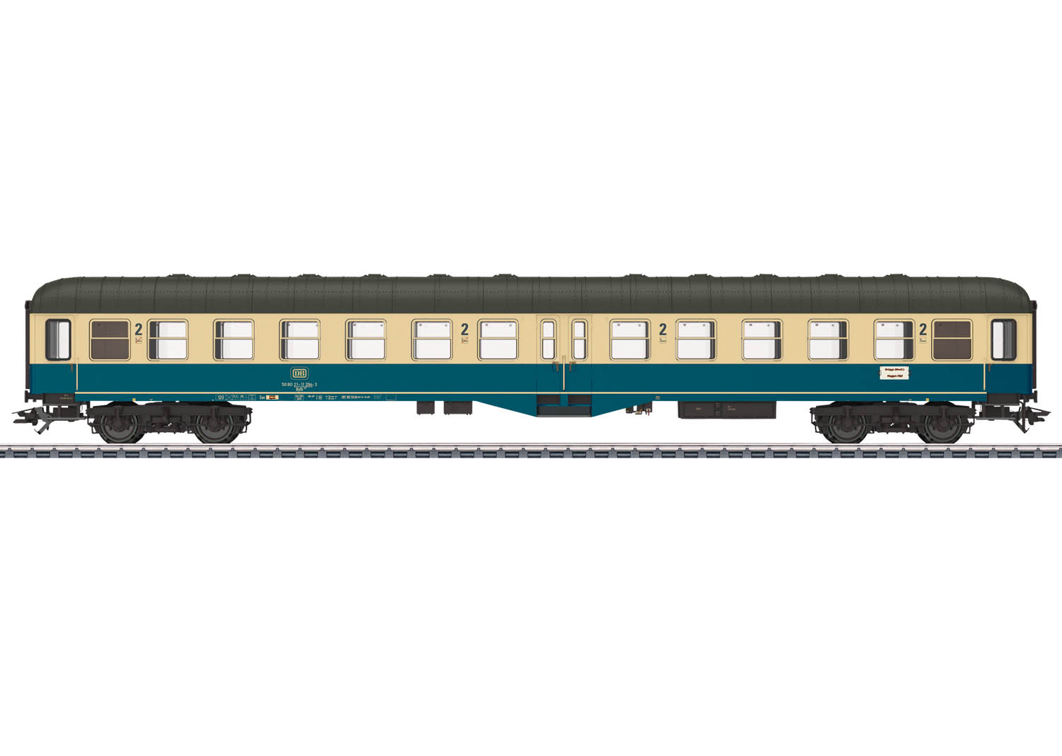 Serienmäßig eingebaute LED-Innenbeleuchtung und Strom führende Kupplungen. Die Innenbeleuchtung funktioniert nur im Verbund mit dem Mitteleinstiegs-Steuerwagen und kann über einen Decoder im Steuerwagen digital ein- und ausgeschaltet werden. Stirnseitig rot transparente Schlusslicht-Einsätze an den Wagenenden. Typspezifisch gestalteter Unterboden. Drehgestelle Bauart Minden-Deutz schwer mit Doppelklotzbremse und Generator D 62s. Befahrbarer Mindestradius 360 mm. Für die Präsentation in einer Vitrine liegen WC-Fallrohre und Wendezugsteuerleitungen als separat ansteckbare Teile bei. Länge über Puffer 28,2 cm