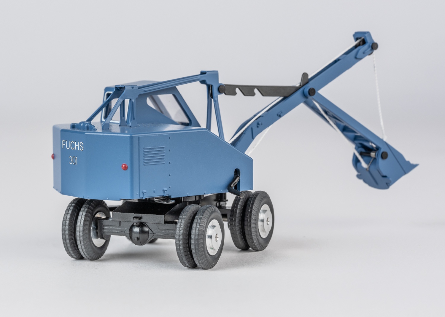 Modell: Wiederauflage des historischen Märklin Fuchs Baggers 8035. Baugröße ca. 1:45. Aufbau, Ausleger, Schaufel und Unterwagen des Baggers aus Metall-Druckguss, Boden aus Stahlblech. Metallräder als Aluminium-Drehteile mit Gummireifen. Scheinwerfer, Rücklichter, Fensterrahmen und weitere Details farblich abgesetzt. Führerhaus mit Fenstereinsatz. Das Modell ist rollfähig, Oberwagen drehbar, verstellbarer Ausleger,und Hebe- Senkfunktion und Öffnungsfunktion der Schaufel per Kurbel bzw. Hebel.Fahrzeuglänge von ca. 11 bis 12 cm je nach Position des Auslegers.Passende Ergänzung zu den Modellen der Replika Serie und andere.