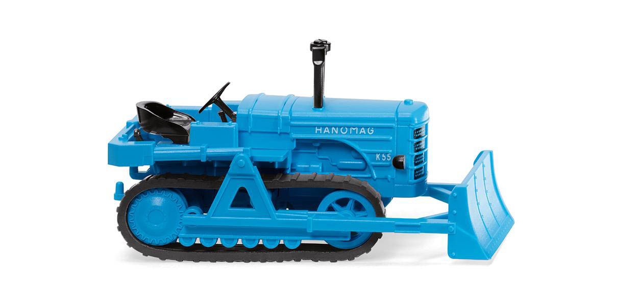 Der Kettenschlepper K55 aus den Hannoveraner Hanomag-Werken, dessen Typenkennzeichen für den 55 PS starken Dieselmotor steht, besitzt in der Modellhistorie der WIKING-Chronologie eine einzigartige Alleinstellung: Er wurde bereits in den 1950er-Jahren im Maßstab 1:25 von den Berliner Modellbauern als reines Anschauungsmodell ausschließlich für Hanomag konzipiert. Beim Abnehmen der Haube war der Blick auf den nachgebildeten Motor freigegeben. Mehr noch fiel auf: Es war mehr als ungewöhnlich, dass Kettenfahrzeuge mit einem Lenkrad gesteuert wurden. Der Hanomag K55 war die seltene Ausnahme, denn ansonsten war die gelernte Hebelsteuerung an der Tagesordnung. Kein Wunder also, dass der K55 mit Räumschild – egal ob in Forst und oder auf der Baustelle – auch für die unerfahrenen Männer auf dem Fahrersitz leichter zu steuern war.