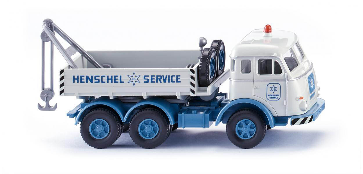 Fahrerhausoberteil sowie mittlerer Sockel und Schwerlastpritsche papyrusweiß. Fahrerhausunterteil sowie Kühlergrill, Fahrgestell mit Kardanteil sowie hintere Doppelkotflügel hellblau. Einrichtung anthrazitgrau. Sattelplatte silber. Einlegeplatte für Kranteil, Aufsteller, Haken und Suchscheinwerfer silber. Felgen hellblau. Kühlergrill mit silbernem Henschel-Stern und Henschel-Schriftzug bedruckt. Ebenfalls silbern umlaufende Zierlinien am Fahrerhaus. Henschel-Stern und Henschel-Schriftzug im Rahmen auf den Türen capriblau bedruckt. Seitliche und heckseitige Warnschraffur. Pritschenbedruckung mit Henschel-Stern und Schriftzug Henschel Service capriblau. Warnlicht orangetransparent eingesteckt.