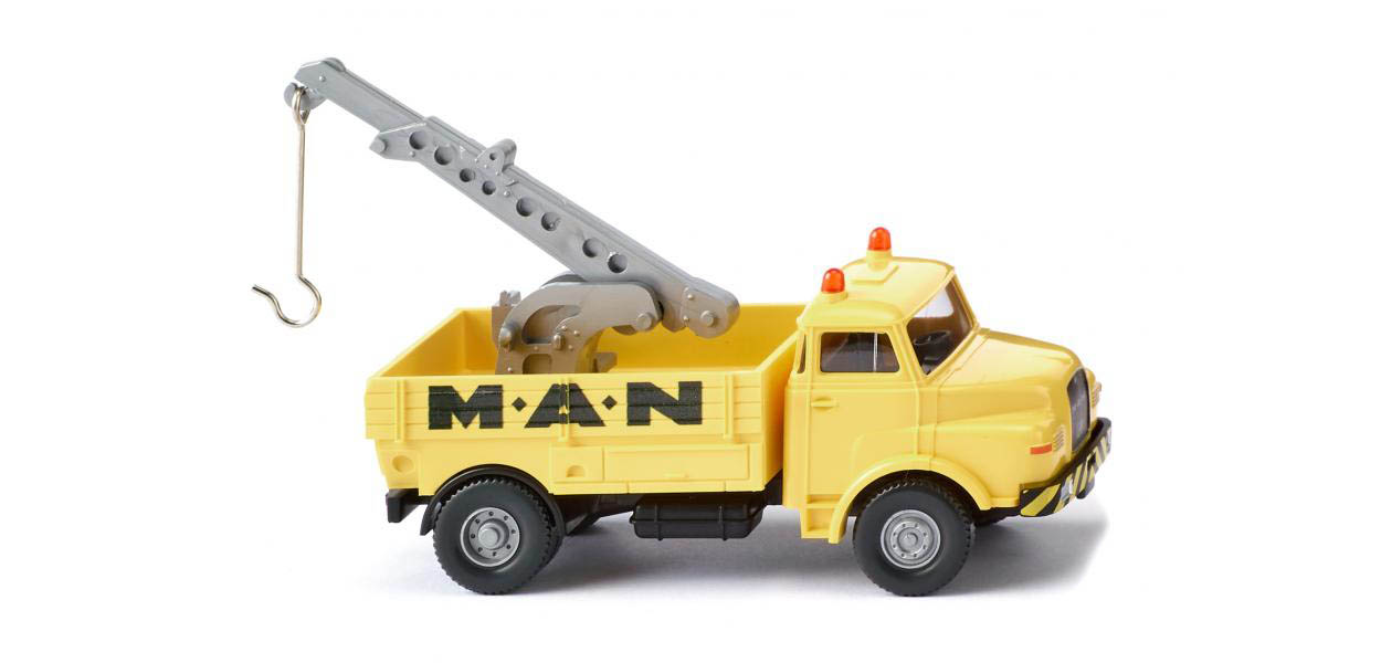 Fahrerhaus mit Pritsche zinkgelb, Sockel für Warnlicht zinkgelb eingesetzt. Warnleuchte orangetransparent eingefügt. Inneneinrichtung anthrazitgrau, Fahrgestell mit Kardanteil schwarz. Drehsockel mit Kranarm silber sowie Kranhaken aus Metall. Kotflügel und Sattelplatte schwarz, Felgen silber. Vordere Grillfläche mit Zierrahmen und Schriftzug MAN silbern bedruckt. Seitliche Blinker signalorange. Rückleuchten karminrot bedruckt. Stoßstangen mit zinkgelber Warnschraffur. Seitliche Pritschenbedruckung mit schwarzem Schriftzug MAN. Heckseitig Warnschraffur. Scheinwerfer in Frontstoßstange per Hand gesilbert.