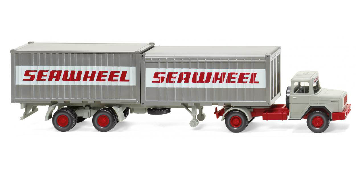 Dunkelachatgraues Fahrerhaus und hintere Kotflügel, Inneneinrichtung mit Lenkrad basaltgrau. Fahrgestell mit Kardanteil und Felgen karminrot, silberne Sattelplatte. Rot bedruckter Kühlergrill mit silbernem Magirus-Deutz-Schriftzug und Logo. Gesilberte Türgriffe, Kotflügelaußenkanten und Trittkante schwarzgrau bedruckt. Heckleuchten karminrot bedruckt. Haltegriff schwarz bedruckt. Verglasung mit oben stehendem rotem Schriftzug Seawheel auf weißer Fläche. Aufliegerfahrgestell mit Achshalter dunkelachatgrau gehalten, Felgen karminrot. Heckleuchten karminrot bedruckt. Stahlcontainer mit heckseitigen Türen sowie Open-Top-Container silbern ausgeführt. Weiße Schriftzugfläche mit rotem Seawheel-Schriftzug auf allen Containerflanken.