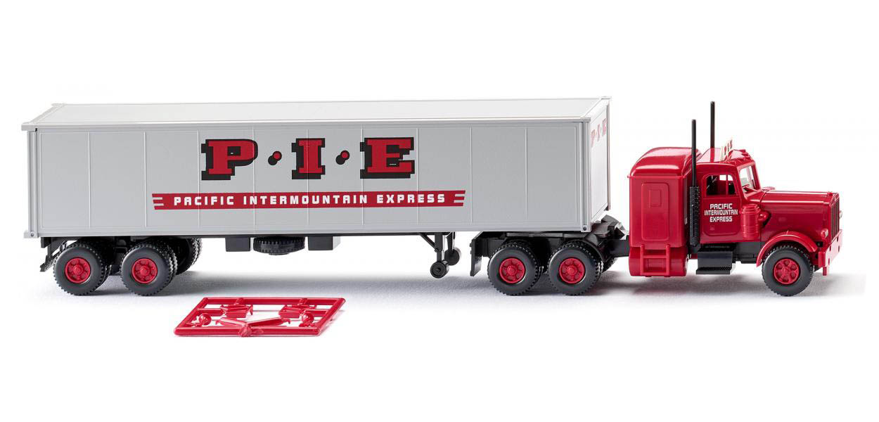 Der Peterbilt Containersattelzug kündet schon auf den ersten Blick von der Freiheit der US-Highways. Das imposante Erscheinungsbild der amerikanischen Haubertradition im Truckgeschäft macht den Peterbilt so typisch für jene Jahre. WIKING miniaturisierte das Vorbild, um einen typischen US-Truck in den Maßstab 1:87 fahren zu können. Mit diesem Modell knüpfen die Traditionsmodellbauer auch beim Vorbild an die Historie an, denn das Original war einst im Einsatz der US-Spedition PIE, die zwischen 1927 und 1990 Logistikdienstleistungen übernahm. Fahrerhaus mit Motorhaube und Kotflügeln rot, Inneneinrichtung schwarz. Kühlergrill sowie Tanks und Karosseriedetails rot. Fahrgestell mit Kardanteil schwarz. Schlafkabine, Felgen und Luftfilter rot. Dachschild weiß aufgesetzt, Sattelplatte silber. Fahrerhausbedruckung mit weißem Schriftzug Pacific Intermountain Express. Kühlergrill mit schwarzer Struktur sowie gesilberten Scheinwerfern und Logofläche. Dachschild mit verkehrsroten Lettern PIE und schwarzer Outline. Auflieger mit schwarzem Fahrgestell und Achshalterung. Container mit Dach und Türen silbergrau, Felgen rot. Container-Bedruckung mit weißem Schriftzug Pacific Intermountain Express sowie Logo mit verkehrsroten Lettern PIE und schwarzer Outline.