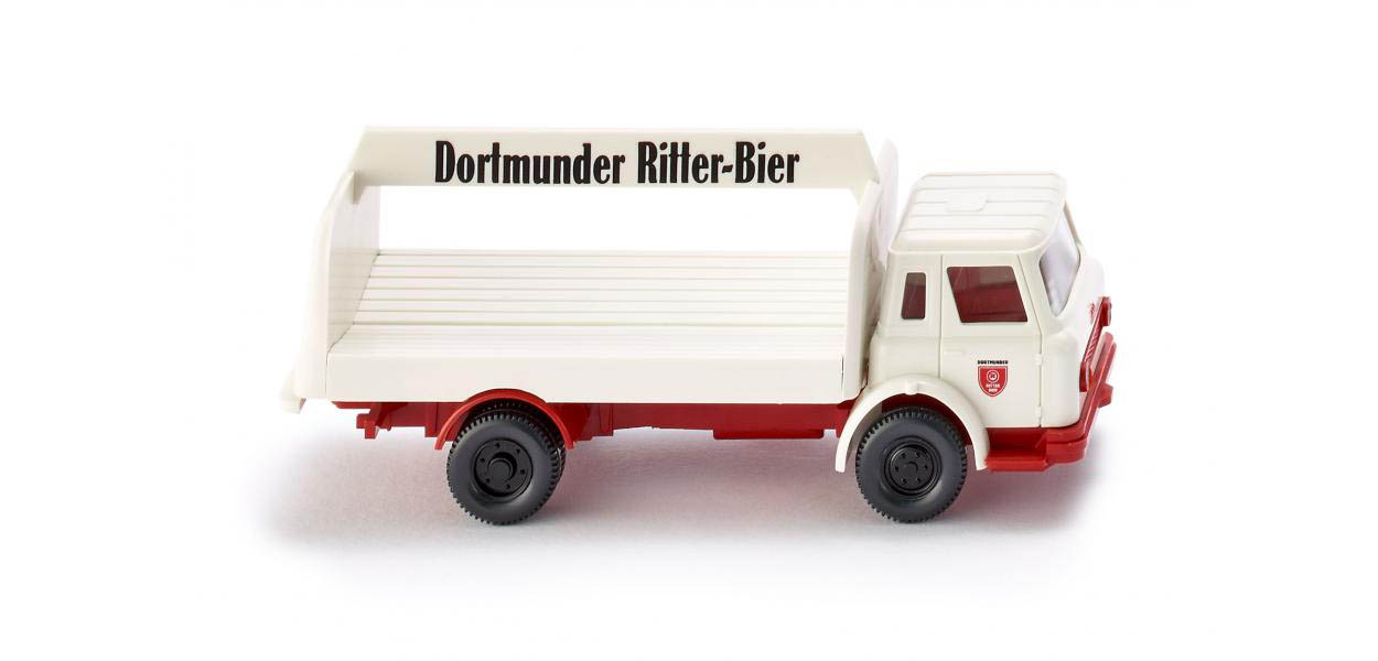 Die Dortmunder Ritter-Brauerei schaffte Fakten: Mit dem International Harvester Loadstar wurde einst ein im Ruhrrevier doch höchst selten anzutreffendes Fahrzeug auf Auslieferungstour geschickt. Dabei erscheint der durch und durch amerikanisch wirkende IH Loadstar in der weißroten Markengestaltung denkbar ungewöhnlich – Grund dafür ist seine glatte, kühlergrillminimalisierte Frontgestaltung. Mit dem Getränkeaufbau ergibt sich ein seltenes, aber zeitgenössisch attraktives Modell, das für das Verkehrsgeschehen der 1960er- und 1970er-Jahre steht. WIKING benötigte den IH Loadstar einst, um die internationalen Märkte mit einem markttypischen Modell zu beliefern.