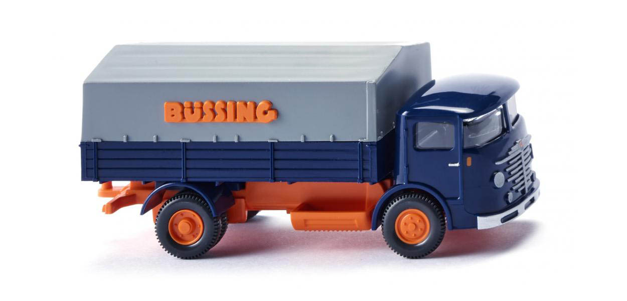Fahrerhaus und Pritsche sowie hintere Kotflügel kobaltblau. Inneneinrichtung perlgrau, Fahrgestell mit Anhängerkupplung und Felgen hellrotorange. Pritscheneinleger und Plane staubgrau. Seitlicher Büssing-Schriftzug auf der Plane hellrotorange. Fahrerhausfront mit vier silbernen Scheinwerfern sowie silberner Büssing-Spinne. Büssing-Logo hellrotorange und kobaltblau bedruckt. Zierleisten der Stoßstange silbern bedruckt. Fahrerhausseiten mit silbernem Türgriff und gelborangen Blinkern.