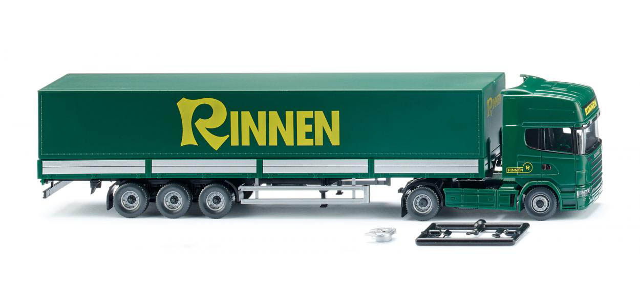 Zugmaschine: Fahrerhaus und Fahrerhausunterteil mit Unterfahrschutz moosgrün, Verglasung topaz. Inneneinrichtung schwarzgrau, Lenkrad schwarz. Fahrgestell, Kardanteil, Auspuff und hintere Kotflügel schwarz. Sattelplatte silber, Scheinwerfer transparent eingesetzt. Felgen silber. Fahrerhaus mit schwarzer Scheibenumrandung sowie Scheibenwischern in schwarz, Schriftzug Scania silbern bedruckt. Seitlicher Firmenhinweis mit rapsgelbem Rinnen-Logo. Lufteinlass und Kühlergrill schwarzgrau, Blendenscheinwerfer silbern bedruckt. Typenhinweis R 420 ebenfalls silbern bedruckt. Türgriffe handbemalt. Auflieger mit moosgrüner Pritsche und Verdeck, Fahrgestell mit hinteren Kotflügeln sowie Achshalter, Stützbeine und seitlicher Unterfahrschutz schwarz. Felgen silber gehalten. Plane mit rapsgelbem Rinnen-Schriftzug sowie gleicher Schriftzug vorn und hinten.