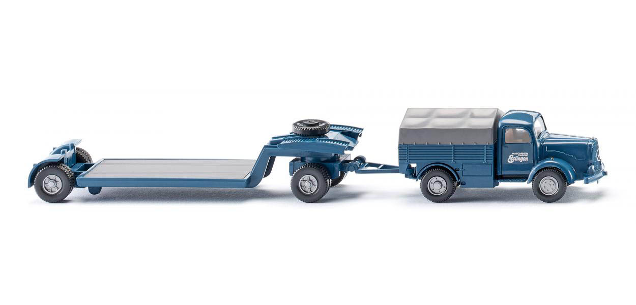 WIKING hat die Erfolgsgefährte der Esslinger Maschinenbaufabrik seit langem im Programm: Der Gepäckwagen und auch der erste Gabelstapler entstanden nach deren Vorbildern und fanden ihren Einsatz auf Tausenden von Modelleisenbahnen. Jetzt hat ein Schwerlastzug-Gespann Premiere, das auch die anderen Maschinen des damaligen Vorbildherstellers zum Adressaten beförderte. Der Mercedes-Benz L 5000 verfügt über eine Schwerlastpritsche mit Plane, während der Tieflader tonnenschwere Lasten bewältigen konnte. Gruben- und Industriebahnen, dazu noch Gabelstapler – die Maschinenfabrik Esslingen hatte ein breites Produktionsspektrum. 1965 übernahm Daimler-Benz von der Gutehoffnungshütte einen Großteil der Anteile der Maschinenfabrik Esslingen. Das Geschäft mit Flurförderfahrzeugen wurde später von Still übernommen – auch diesen Staplern ist WIKING bekanntermaßen treu geblieben.