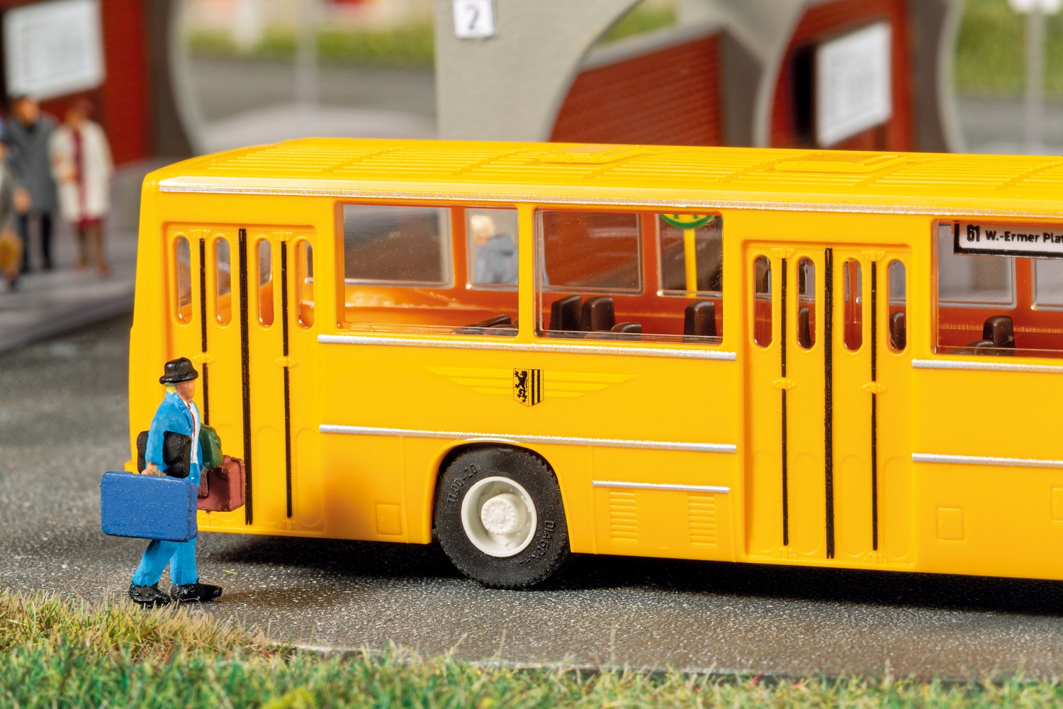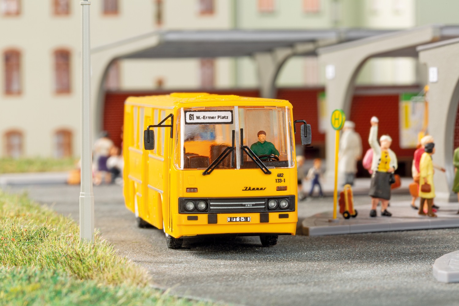 Bausatz. Fein detaillierte und akkurat bedruckte Modellnachbildung des dreitürigen Stadtomnibus „260“ des ungarischen Herstellers Ikarus. Bündig einzusetzende Scheiben sowie einzeln zu montierende transparente