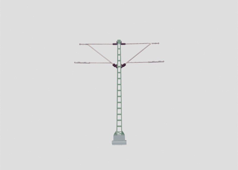 Gittermast und zwei Ausleger aus Metall. Beide Ausleger elektrisch getrennt. Sockel mit Befestigungsschraube und Steckverbindung sowie zusätzlicher Halterung am C-Gleis. Höhe 100 mm. Packung mit 1 Stück.