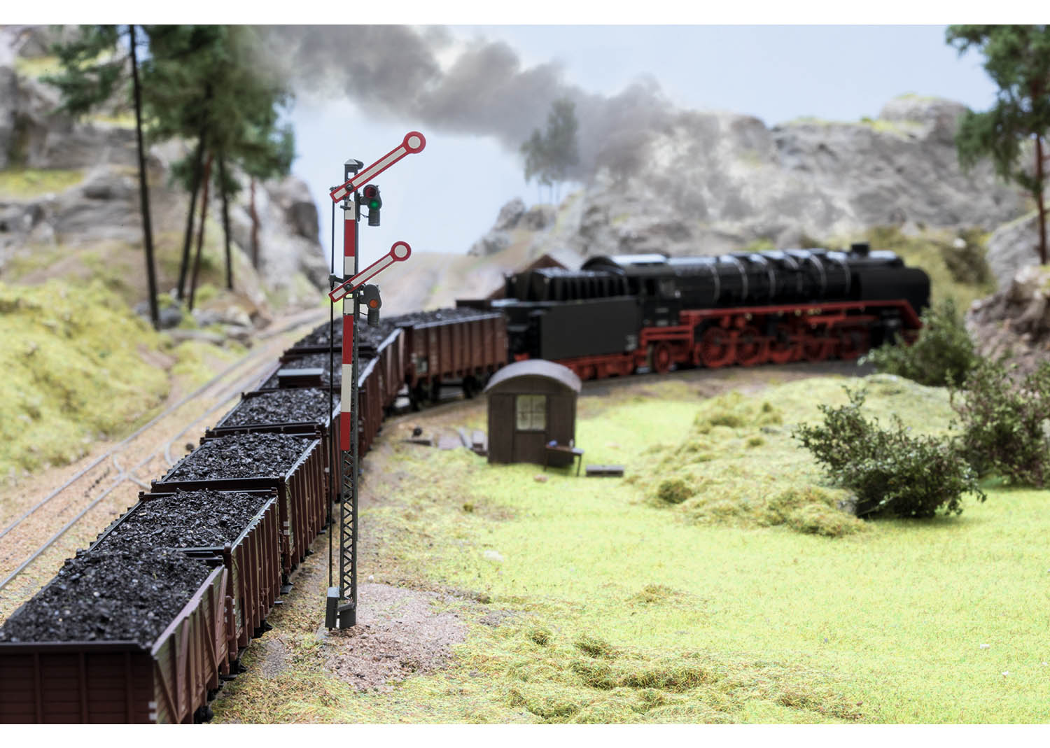 Mit 2 ungekoppelten Flügeln und durchbrochenem, grauem Gittermast. Wechsel von Rot (Hp 0) auf Grün (Hp 1) oder Rot (Hp 0) auf Grün/Gelb (Hp 2).
