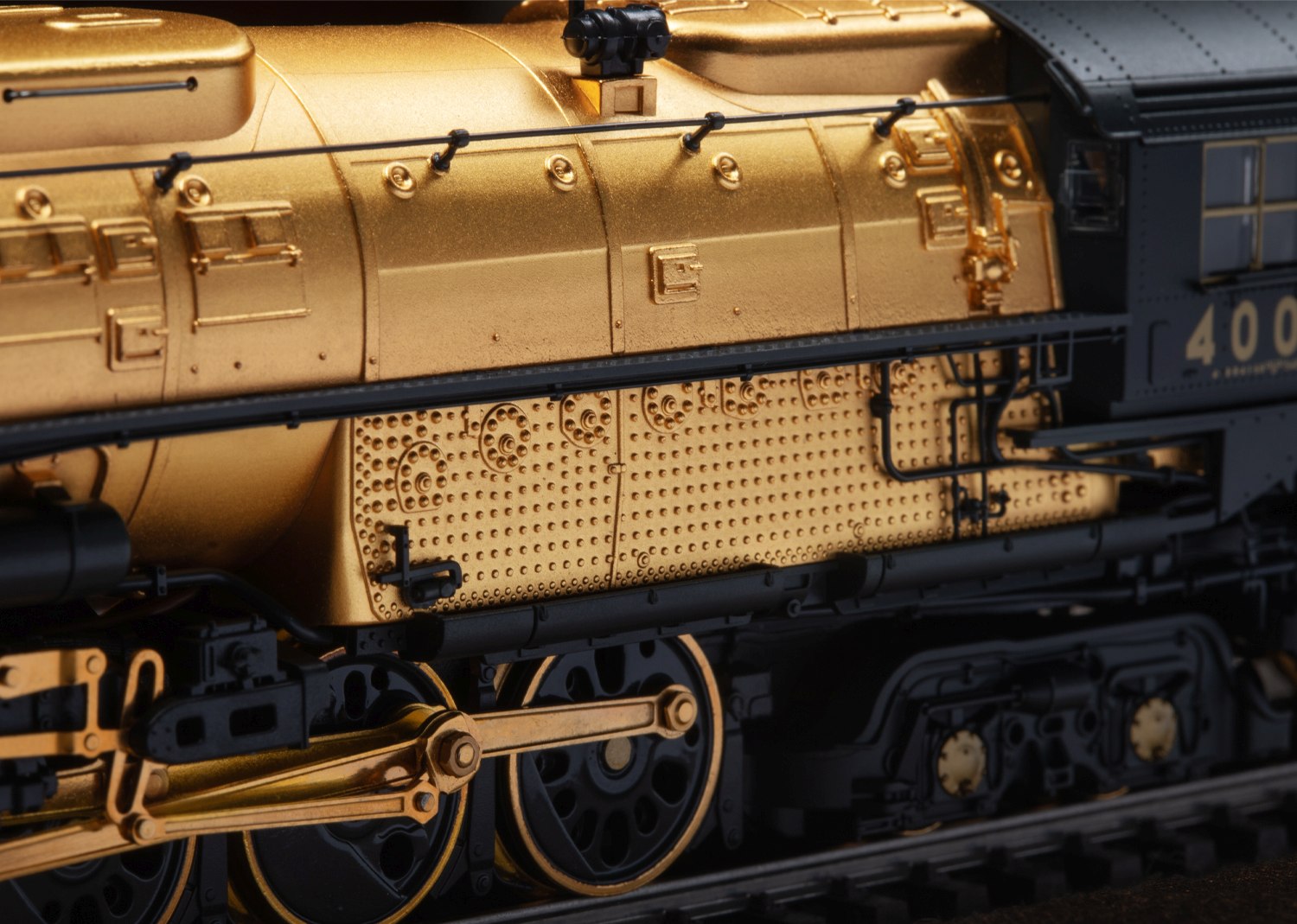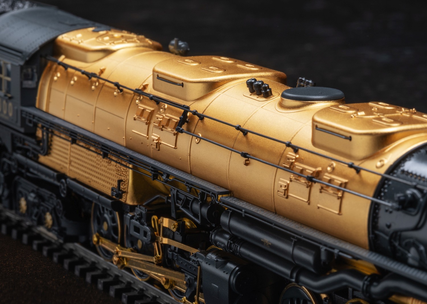 Modell: Rauchkammertür, Kesseloberteil, Tenderkasten, Treibradsätze, Laufradsätze, Gestängeteile sowie diverse Ansetzteile aus Metall und mit 24 Karat Feingold beschichtet. Mit Digital-Decoder mfx+ und umfangreichen Geräuschfunktionen. Geregelter Hochleistungsantrieb. 2 Achsen angetrieben, 6 Achsen über Kuppelstange angetrieben. Haftreifen. Kurvengängiges Gelenkfahrwerk. Boxpok-Räder. Mittlere Kuppelachsen gefedert. Stirnlampe, Tender und Nummerntafeln mit wartungsfreien warmweißen Leuchtdioden (LED) beleuchtet. 2 Rauchsätze (7226) nachrüstbar, Kontakte ständig betriebsbereit. Spitzensignal- und Nummerntafelbeleuchtung konventionell in Betrieb, digital schaltbar. Führerstandbeleuchtung digital schaltbar. Stirnseitig Kupplungshaken im Schienenräumer einsteckbar. Kurzkupplung zwischen Lok und Tender. Dampfleitungen schwenkbar mit den Zylindern geführt. Angesetzte Griffstangen aus Metall. Viele angesetzte Einzelheiten. Lokführerfigur und Heizerfigur für den Führerstand liegen bei.Der Big Boy wird in einer exklusiven Verpackung mit Echtheitszertifikat ausgeliefert. Lokomotive und Echtheitszertifikat sind durchnummeriert. Ein Paar weiße Baumwoll-Handschuhe sowie ein Booklet über die Entstehung des Modells liegen bei. Zusätzlich liegt ein mit 24 Karat Feingold beschichteter Schleifer bei, zum Austausch gegen den serienmäßig montierten Fahrschleifer.Länge über Kupplungen ca. 46,5 cm.