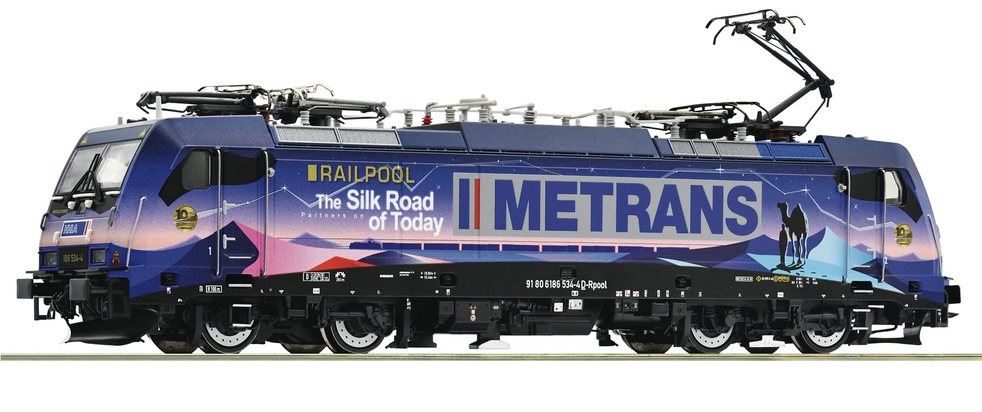 Metrans ist einer der führenden europäischen Anbieter intermodaler Containertransporte im Seehafen-Hinterlandverkehr und gehört zu den Pionieren des stark wachsenden Bahntransports entlang der Neuen Seidenstraße. Im vergangenen Jahr hat Metrans die Zahl der Containerzüge, die zwischen Europa und China verkehren, verdoppelt.Anlässlich der zehnjährigen Zusammenarbeit mit Railpool präsentiert sich die kürzlich ausgelieferte 186 534 (TRAXX F140 MS) in einer besonderen Lackierung. Unter dem Motto „Die Seidenstraße von heute“ umfasst die Gestaltung sowohl Elemente der historischen als auch der neuen Seidenstraße auf Schienen.