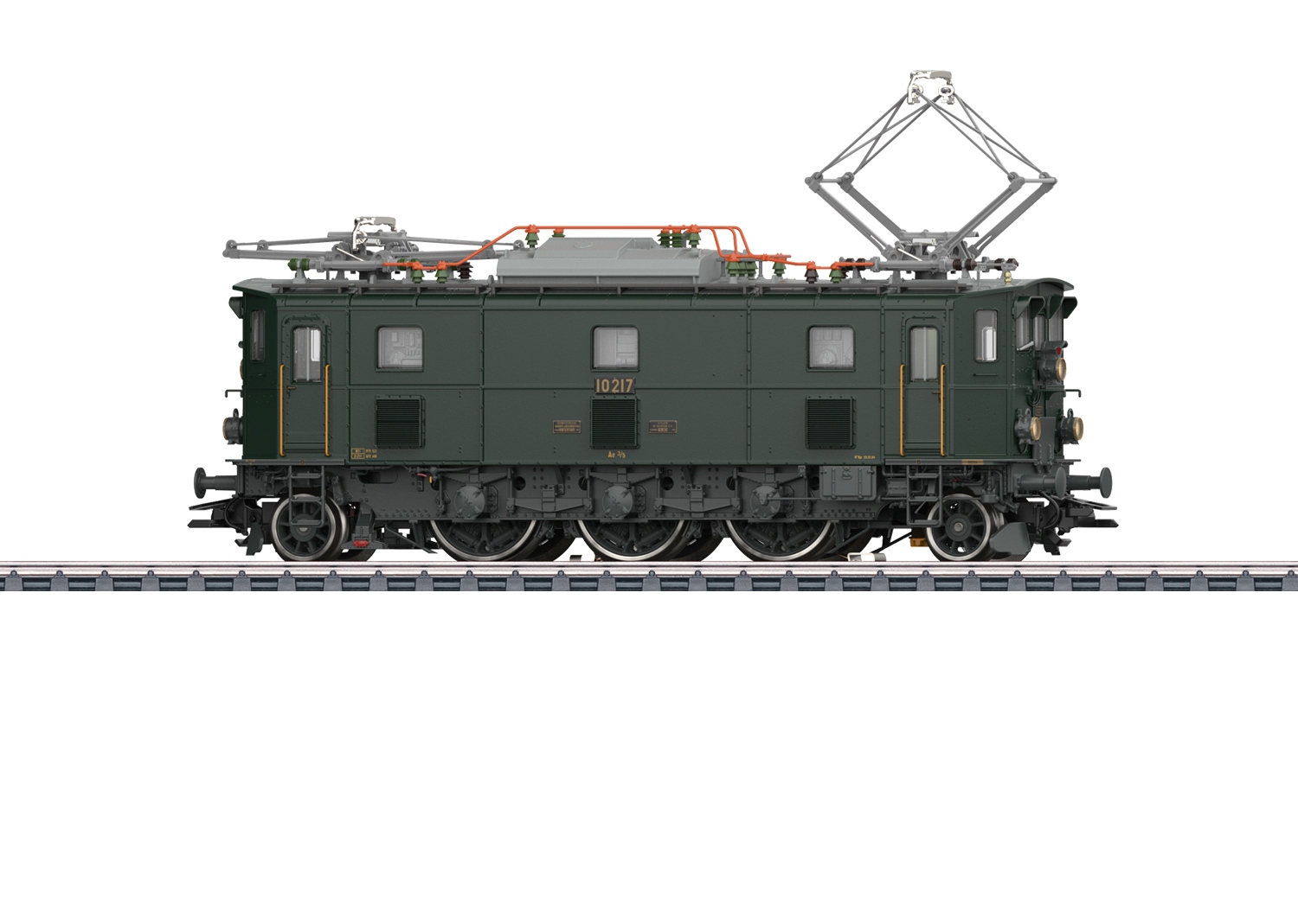 Vorbild: Elektrolokomotive Ae 3/5 der Schweizerischen Bundesbahnen (SBB/CFF/FFS). Mit stirnseitigen Übergangsblechen und Falschfahrsignal über dem oberen Spitzensignal. Tannengrüne Grundfarbgebung mit grauem Fahrwerk. Lok-Betriebsnummer 10217. Betriebszustand 2022.