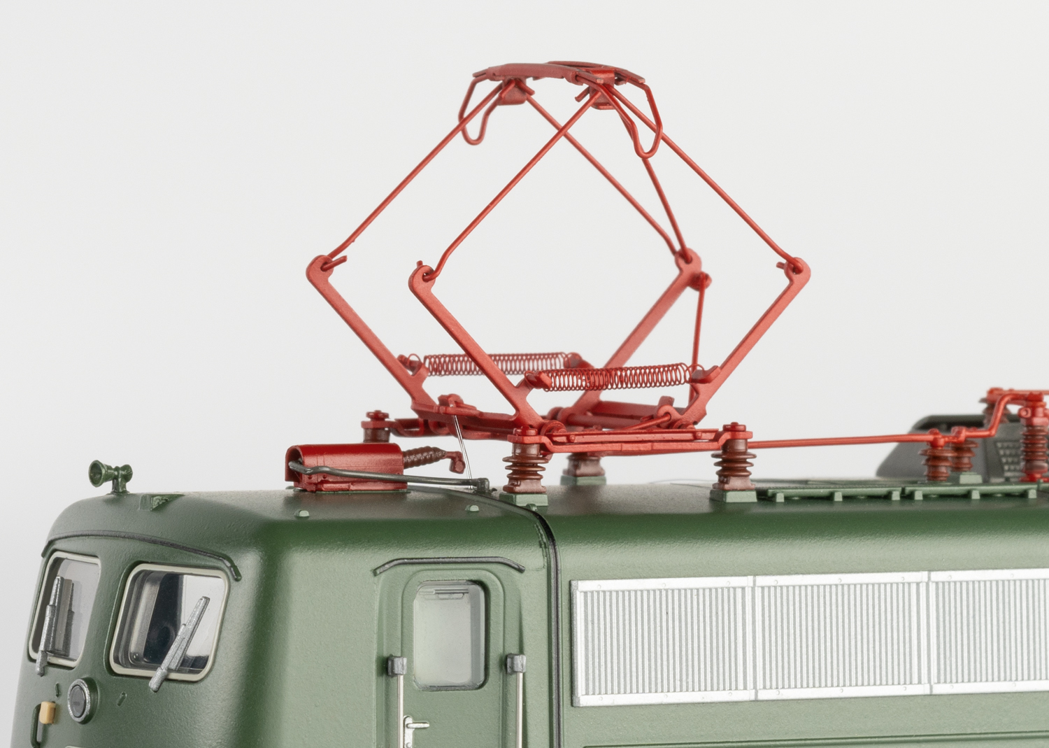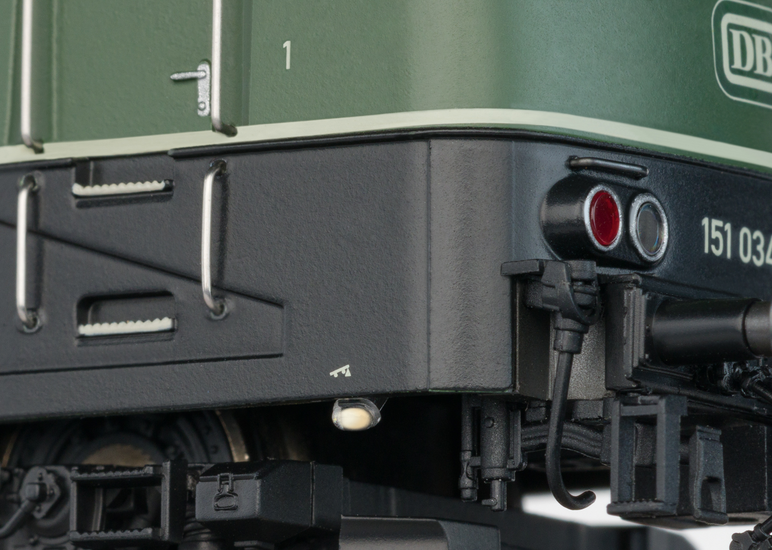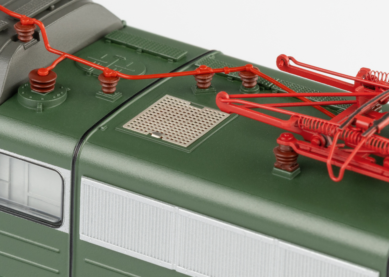 Mit Digital-Decoder und umfangreichen Geräuschfunktionen. Geregelter Hochleistungsantrieb mit Schwungmasse, zentral eingebaut. Jeweils zwei Achsen in jedem Drehgestell über Kardan angetrieben. Haftreifen. Fahrtrichtungsabhängig wechselndes Dreilicht-Spitzensignal und zwei rote Schlusslichter konventionell in Betrieb, digital schaltbar. Spitzensignal an Lokseite 2 und 1 jeweils digital separat abschaltbar. Doppel-A-Licht-Funktion. Führerstandsbeleuchtung mit der Fahrtrichtung wechselnd und Maschinenraumbeleuchtung digital schaltbar. Zusätzlich kann eine Anfahrlampe fahrtrichtungsabhängig digital geschaltet werden. Beleuchtung mit wartungsfreien warmweißen und roten Leuchtdioden (LED). Detailliert ausgeführte Dachaufbauten mit neu konstruierten Stromabnehmern der Bauart DBS 54. Stromabnehmer digital heb- und senkbar. Viele separat angesetzte Teile wie Radimitationen, Griffstangen, Sandkästen, UIC-Steckdosen und Dachleitungen. Pufferhöhe nach NEM. Bremsleitungen, Schraubenkupplungen und verschiedene Steckdosen liegen als separat ansteckbare Teile bei. Länge über Puffer ca. 22,4 cm.