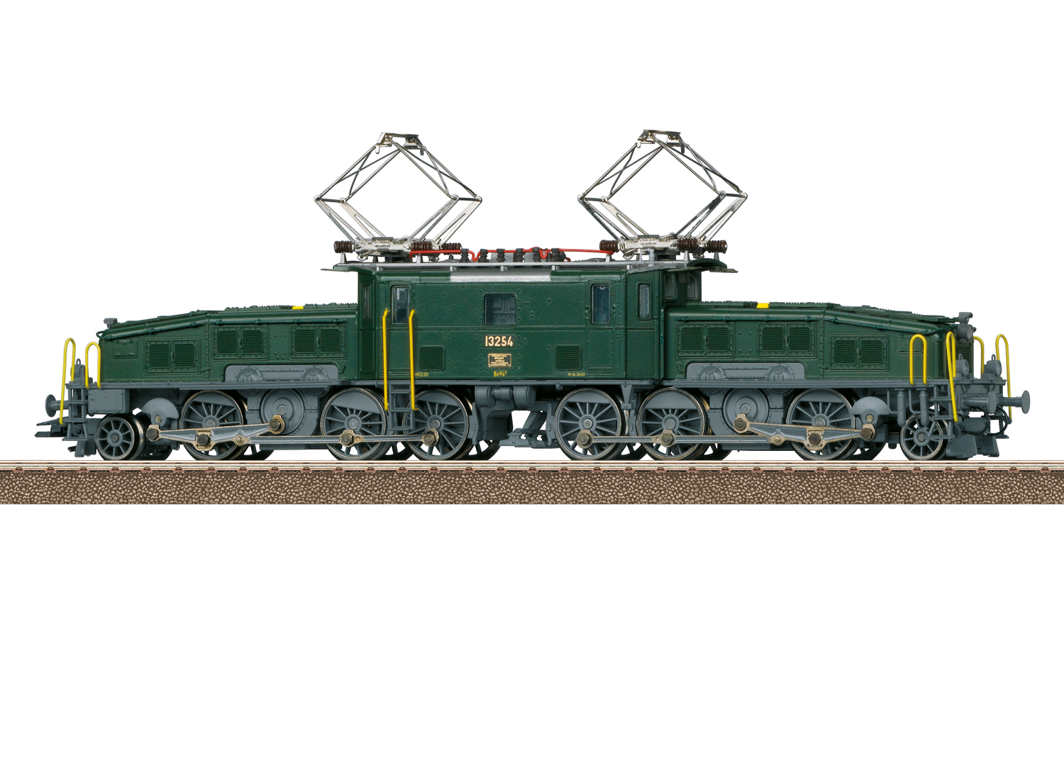 Elektrolokomotive Serie Be 6/8 II „Krokodil“ der Schweizerischen Bundesbahnen (SBB). Bauart aus der ersten Bauserie. Tannengrüne Grundfarbgebung. Mit 2 Führerstandstüren, breiten Rangierertreppen an den Vorbauten und bügelförmigen Haltegriffstangen, Hülsenpuffer, ohne Übergangsbleche, mit Falschfahrsignal und Signum-Integra-Magneten. Lok-Betriebsnummer 13254. Betriebszustand zwischen 1960 und 1965.