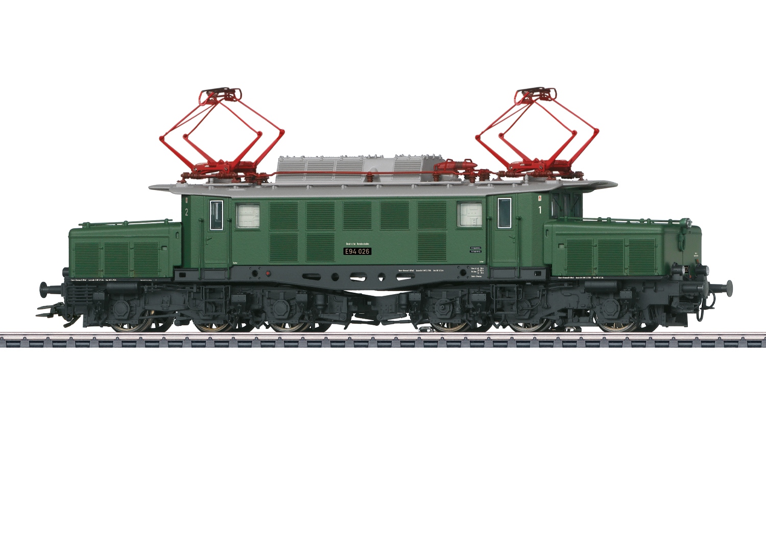Modell: Mit Digital-Decoder mfx+ und umfangreichen Geräuschfunktionen. Geregelter Hochleistungsantrieb mit Schwungmasse, zentral eingebaut. Antrieb auf jeweils zwei Achsen je Treibgestell. Haftreifen. Fahrtrichtungsabhängig wechselndes Dreilicht-Spitzensignal und zwei rote Schlusslichter konventionell in Betrieb, digital schaltbar. Spitzensignal an Lokseite 2 und 1 jeweils digital separat abschaltbar. Wenn Spitzensignal an beiden Lokseiten abgeschaltet ist, dann beidseitige Funktion des Doppel-A-Lichtes. Führerstandbeleuchtung jeweils separat digital schaltbar. Zusätzlich kann eine Anfahrlampe fahrtrichtungsabhängig digital geschaltet werden. Beleuchtung mit wartungsfreien warmweißen und roten Leuchtdioden (LED). Mit Pufferspeicher. Angesetzte Griffstangen. Führerstände und Maschinenraum mit Relief-Inneneinrichtung. Ansteckbare Bremsschläuche und Schraubenkupplungsimitationen liegen separat bei. Länge über Puffer 21,4 cm.
