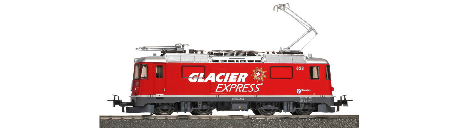 Mit der Lok 623 "Bonaduz", die mit dem plakativen "Glacier Express" Logo beschriftet ist, steht Ihnen neben der Lok 651 "Glacier on Tour" ein weiteres Lokmodell für die Zugbildung und den Betrieb des Glacier Express in der Spurweite 16,5mm für das Zwei- und Dreleitersystem zur Verfügung.