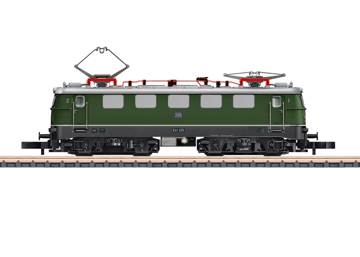 Vorbild: Elektrolokomotive E 41 der Deutschen Bundesbahn (DB) mit 5 Lampen, abgerundeten Lüftern, senkrechten Lamellen und umlaufender Regenrinne. Farbgebung chromoxidgrün. Betriebszustand September 1962.