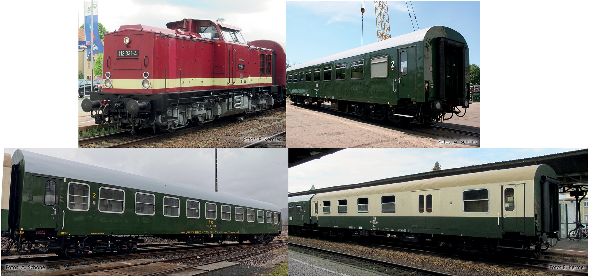 Reisezugwagenset „Museumszug der OSEF e.V.“, bestehend aus einer Diesellokomotive BR 112, einem Reisezugwagen 2. Klasse Bghw und einem Reisezugwagen 2. Klasse mit Gepäckabteil BDwsb und ein Reisezugwagen 2. Klasse Typ Y/B 70, Ep. VI