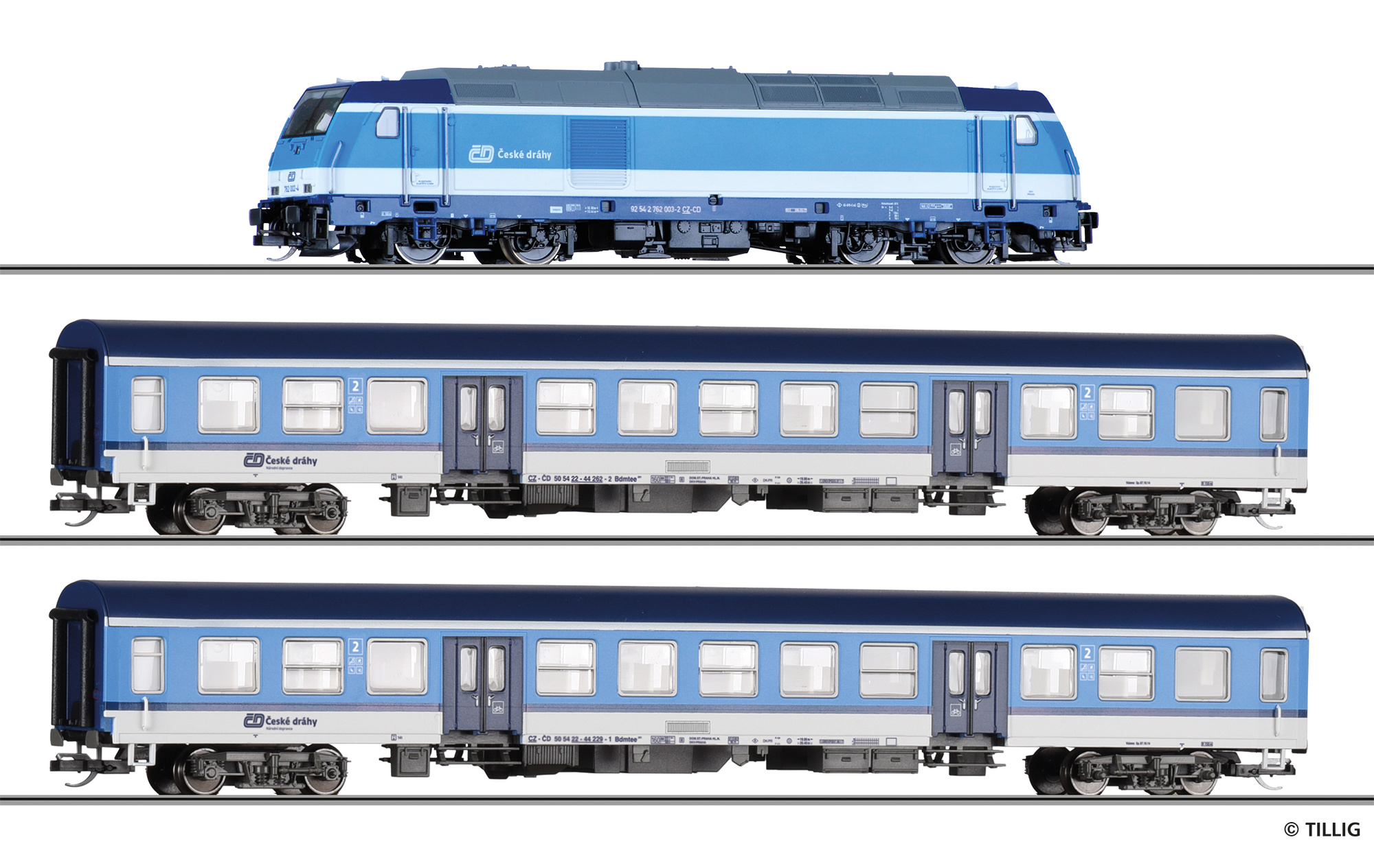 Einsteiger-Set: Reisezug der ČD, bestehend aus Diesellokomotive „TRAXX“ und zwei Reisezugwagen, Bauart Halberstadt, Ep. VI