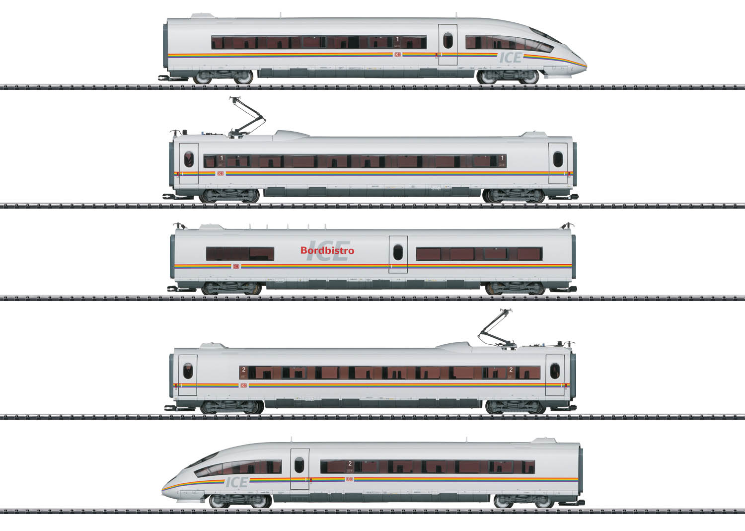 Modell: 5-teilige Ausführung. Mit Digital-Decoder mfx und umfangreichen Geräuschfunktionen. Geregelter Hochleistungsantrieb im Bistrowagen eingebaut. 2 Achsen angetrieben, Haftreifen. Führerstände der Endwagen mit Inneneinrichtung. Fahrtrichtungsabhängige Stromversorgung über den jeweils vorderen Endwagen. Spezial-Kurzkupplungen mit Kulissenführung. Fahrtrichtungsabhängig wechselndes Dreilicht-Spitzensignal und zwei rote Schlusslichter, konventionell in Betrieb, digital schaltbar. Fernlicht zuschaltbar. Serienmäßig eingebaute Innenbeleuchtung. Die Innenbeleuchtung wird versorgt über die durchgehende elektrische Verbindung des ganzen Zuges. Beleuchtung mit wartungsfreien warmweißen und roten Leuchtdioden (LED).