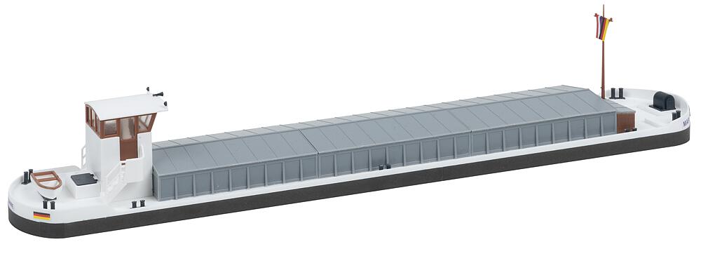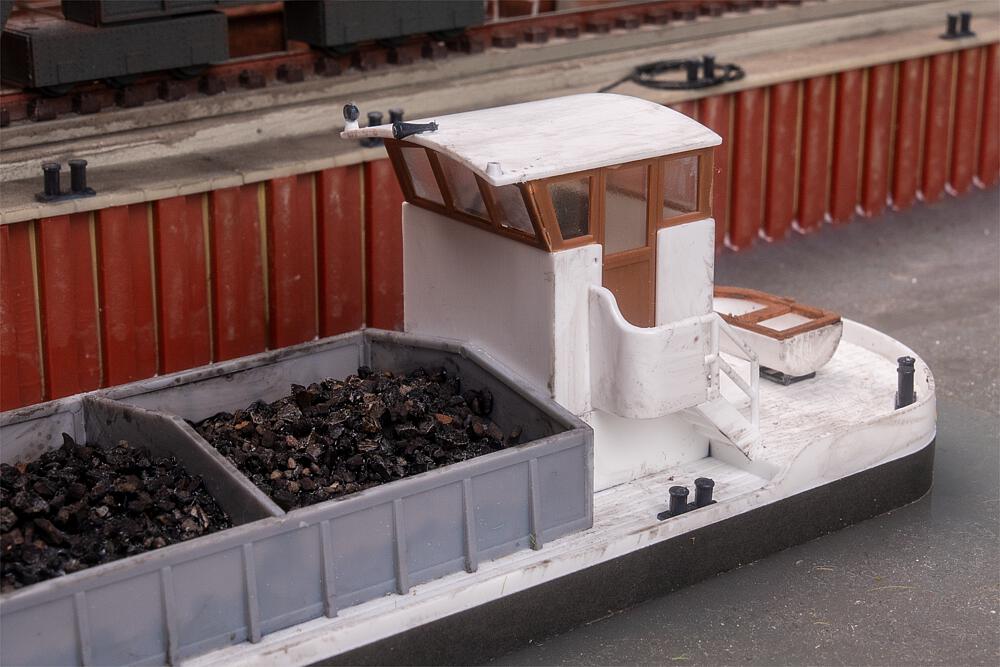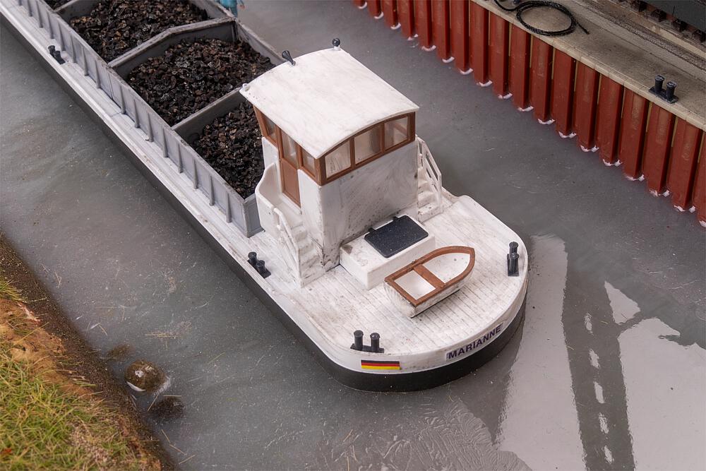 Ein weißes Modellschiff bringt die Welt der Binnenschifffahrt auf die Anlage. Mit seinem schmucken Steuerhaus, dem abgeflachten Rumpf und dem großzügigen Stauraum im zentralen Container ist es bereit, die Miniaturfracht an Bord zu nehmen. Das Modell ist als Wasserlinienversion gestaltet und nicht schwimmfähig.
