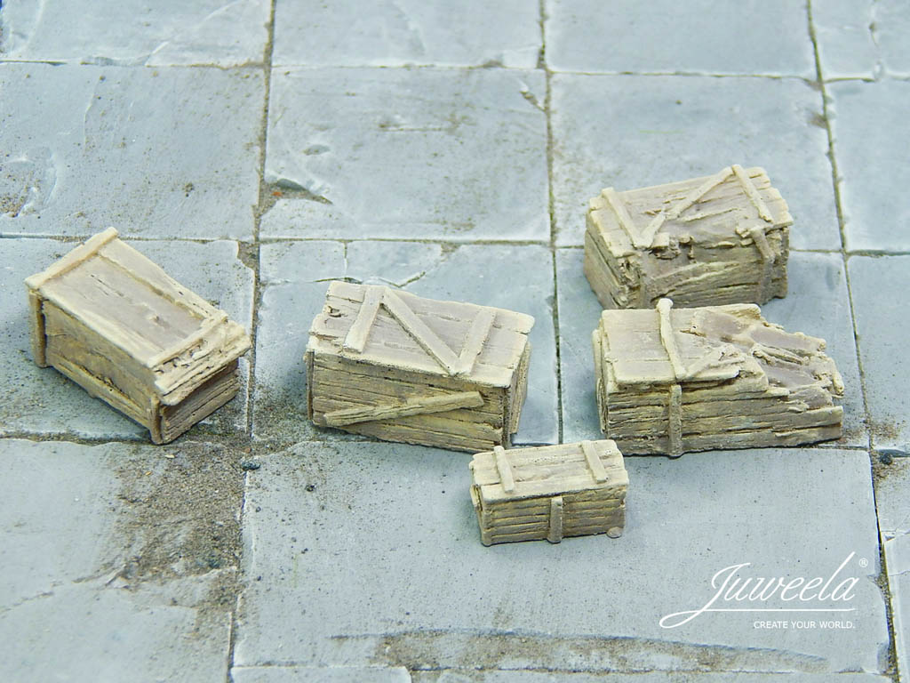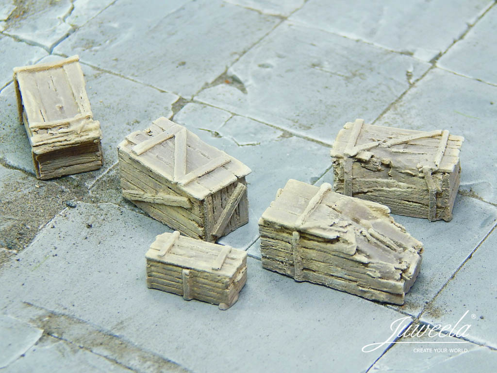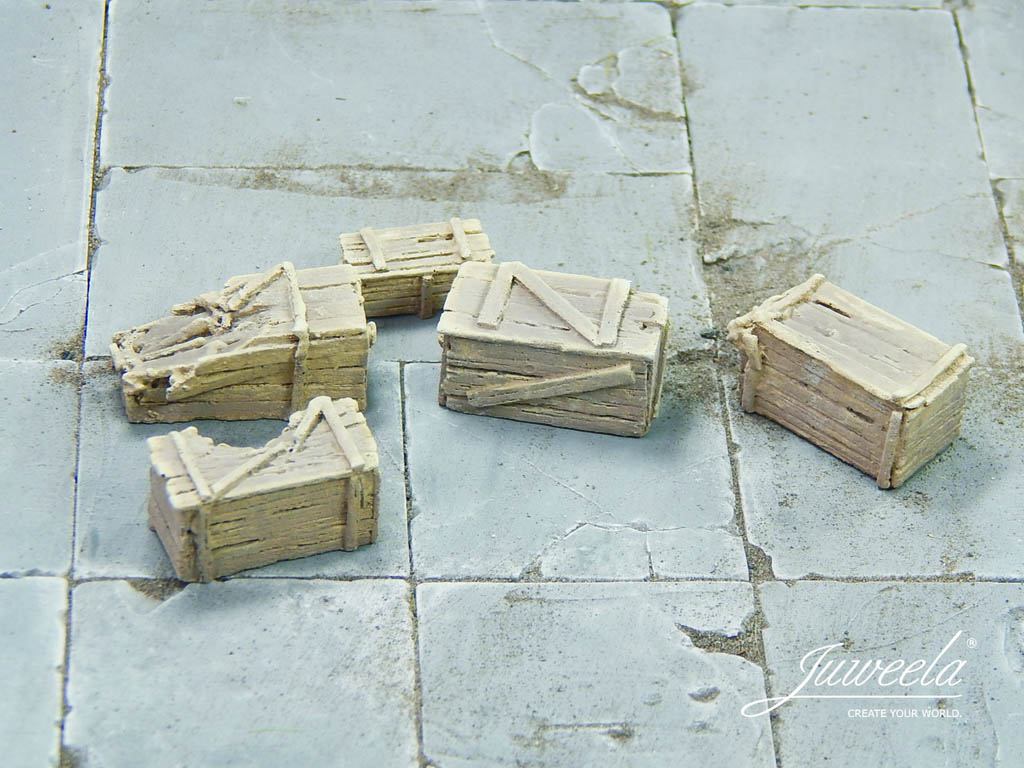 Alte Holzkisten gehören einfach zum üblichen urbanen Bild - im Vorbild ebenso wie im Modell Diorama. Diese hier sind alt, abgenutzt, beschädigt, gesplittert.