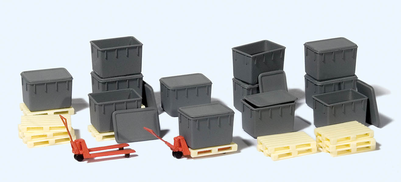 H0 - 12 Kunststoffbehälter, stapelbar, Deckel lose, 12 Paletten, 2 Hubwagen (023-31025) - Mein MBS Shop