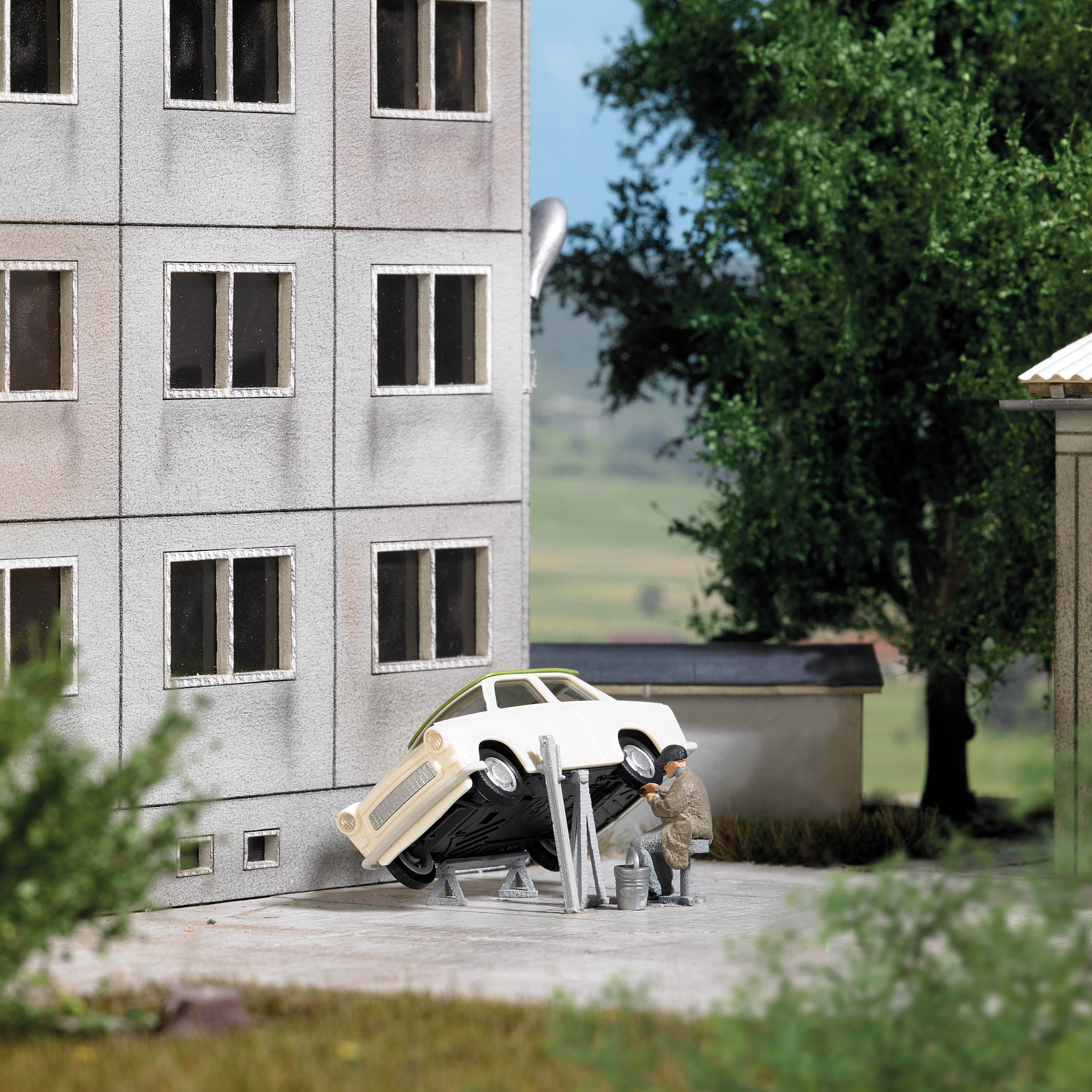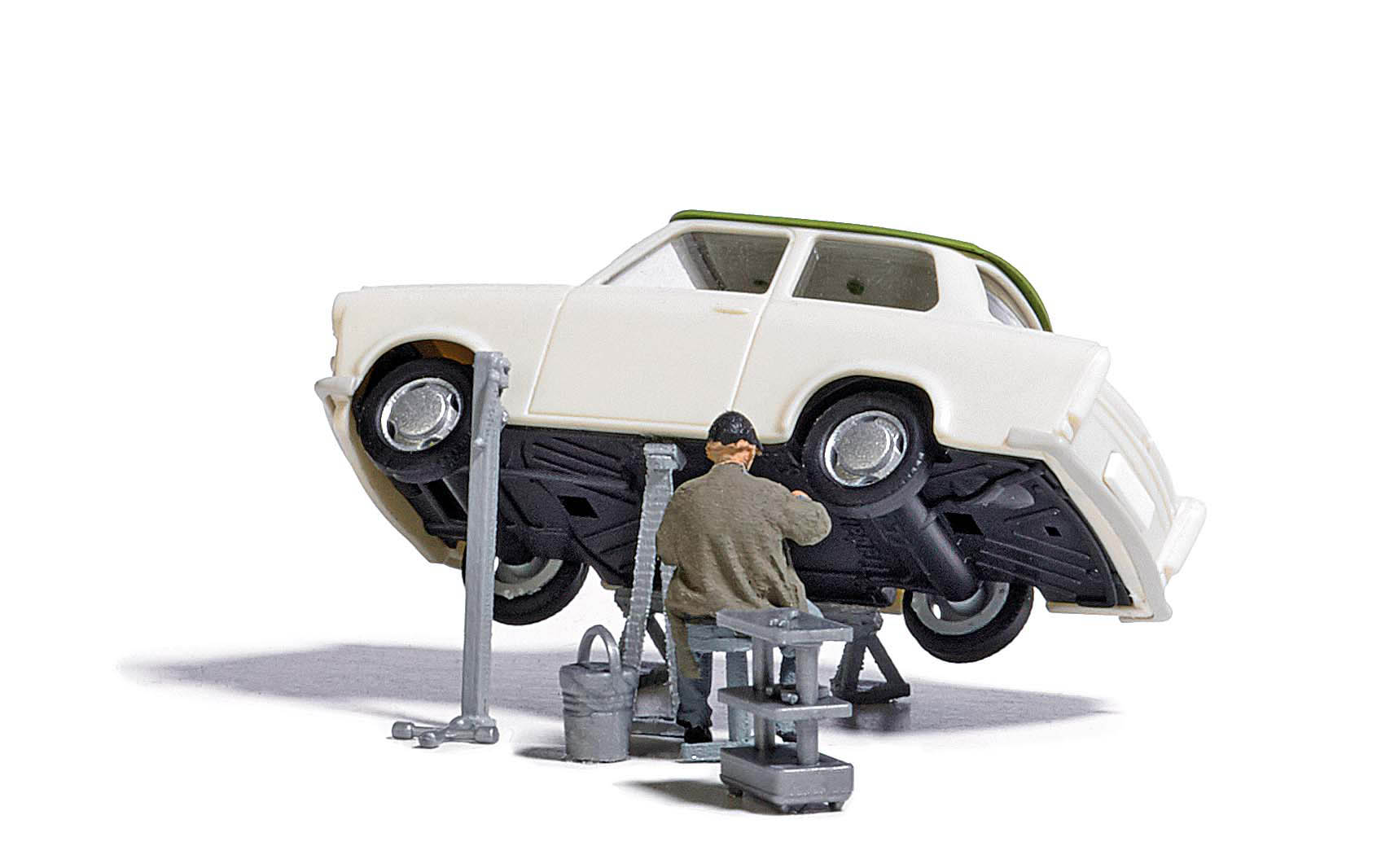 Vierteilige Hebevorrichtung für Wartungs- und Reparaturarbeiten, vorzugsweise an Trabant-PKW. Mit Trabant Limousine, sitzendem Monteur, Werkzeugwagen und
