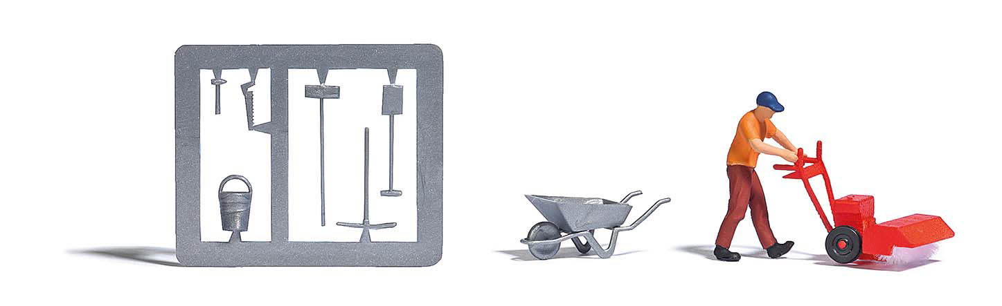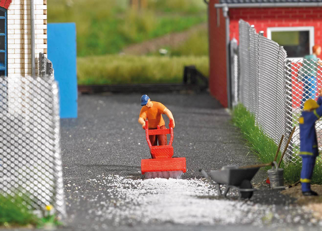 Action Set für die realistische Belebung Ihrer Modellwelt. Arbeiter mit Kehrmaschine für Gehwege und Plätze. Mit Schubkarren und Werkzeug.