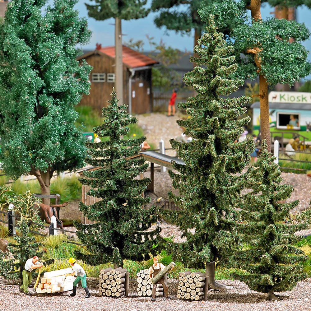 Kleiner Fichtenwald mit passendem Zubehör: Fünf Jungfichten 23 bis 31 mm hoch, jeweils eine Fichte 70, 90 und 120 mm hoch, drei Holzstapel und 10 Bauhölzer aus echtem Holz, jeweils 42 mm lang. Perfekt zur Gestaltung einer kleinen Waldszene oder zur Ausgestaltung der Papierfabrik (Busch Nr. 1557).