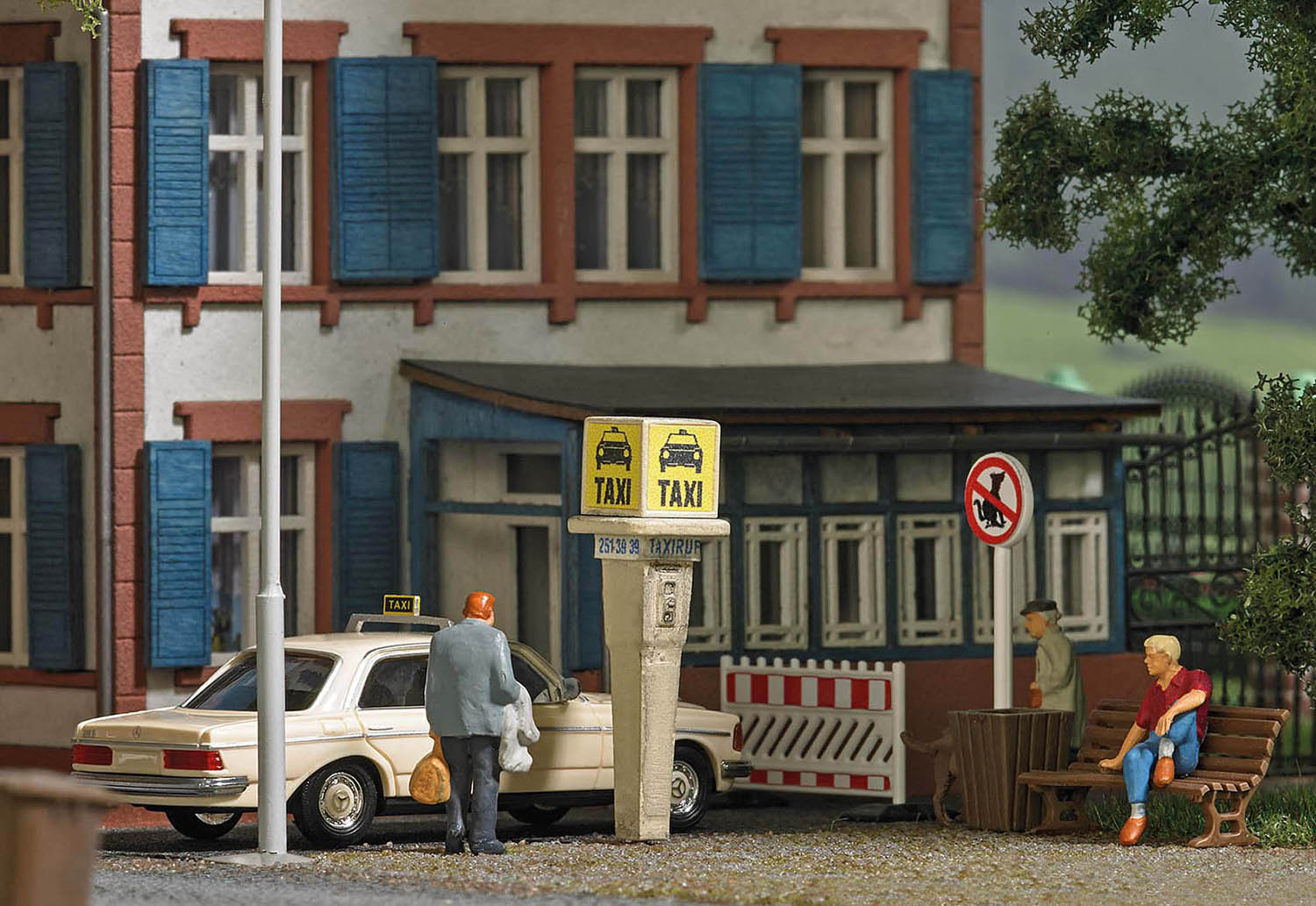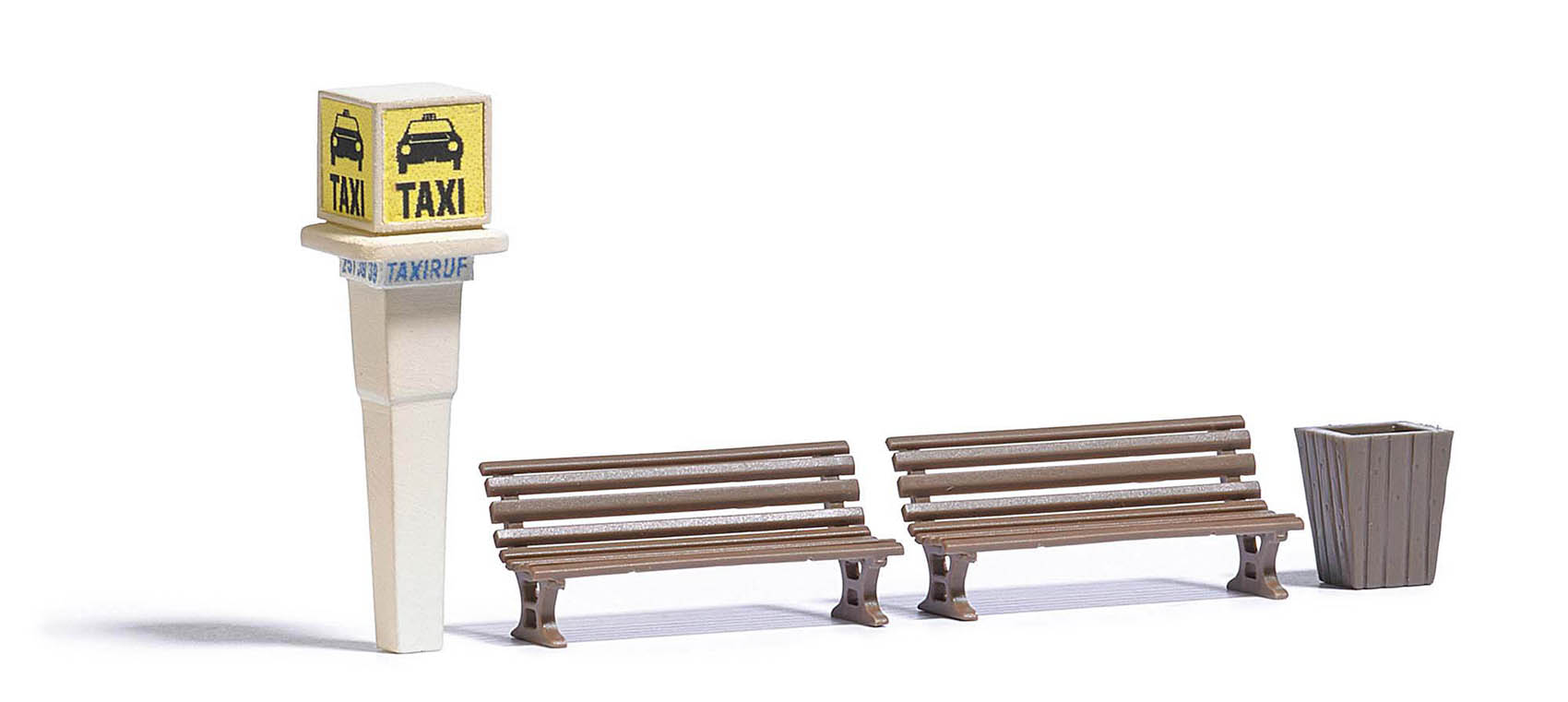 Taxisäule (Höhe 32 mm) nach westdeutschem Vorbild. Mit Sitzbänken und Papierkorb.