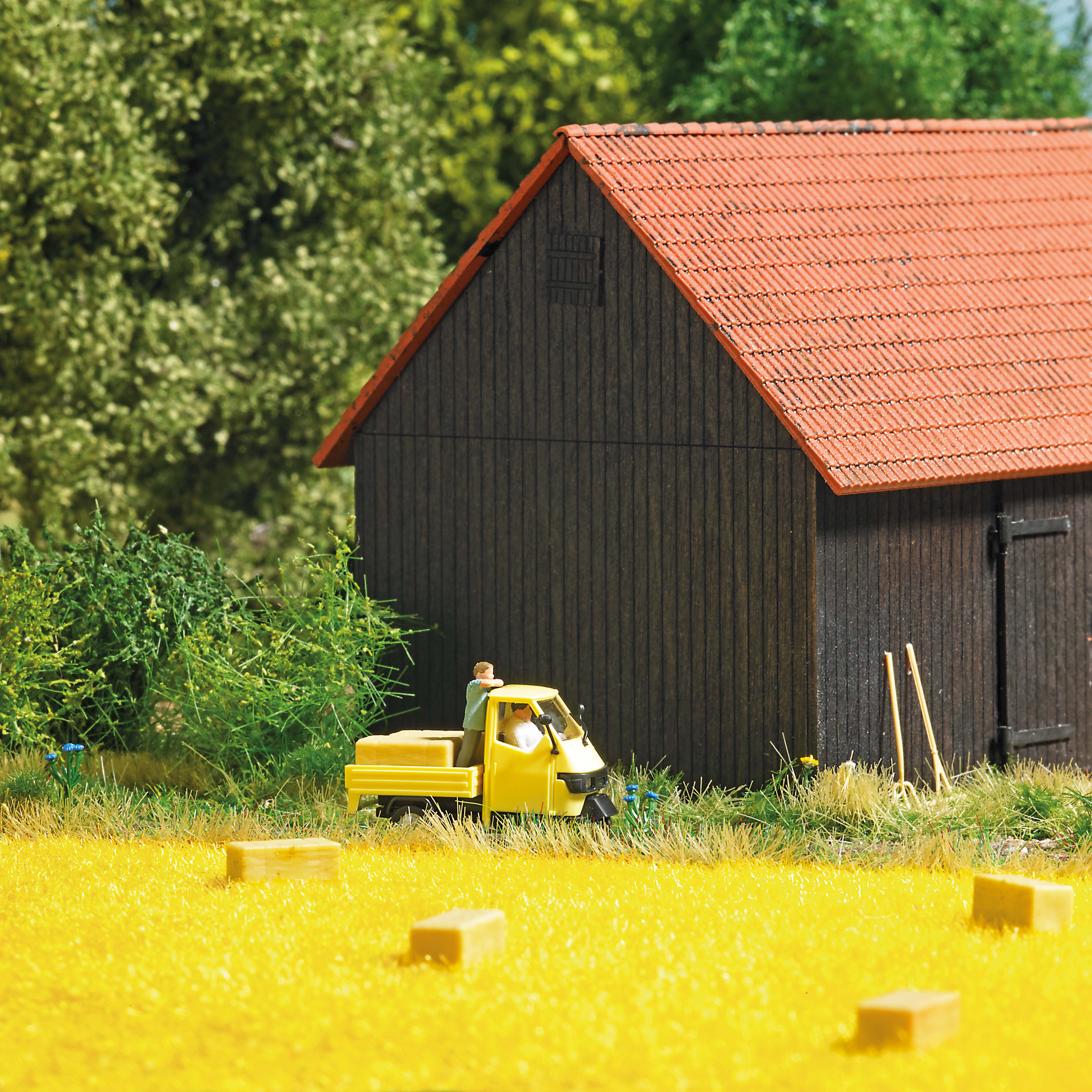 Inklusive 6 weiteren Heuballen und Werkzeug wie Heugabeln, Holzrechen und Sichel.